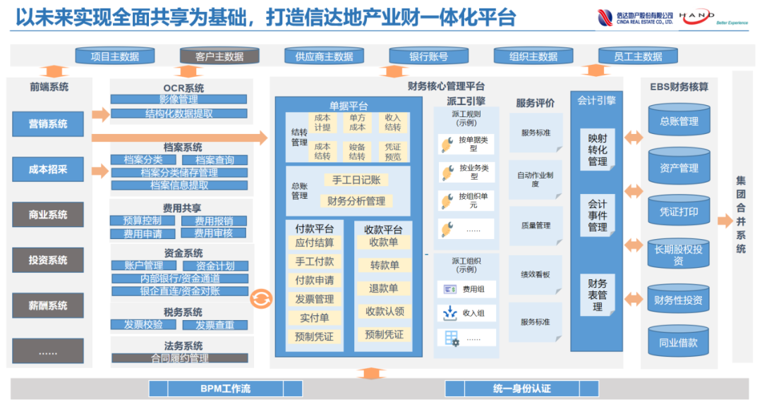 与此同时,技术方面项目组集成地产业务系统及集团已建设系统,保证信息架构灵活,构建信达地产财务生态圈,为后续业务拓展打下良好基础。