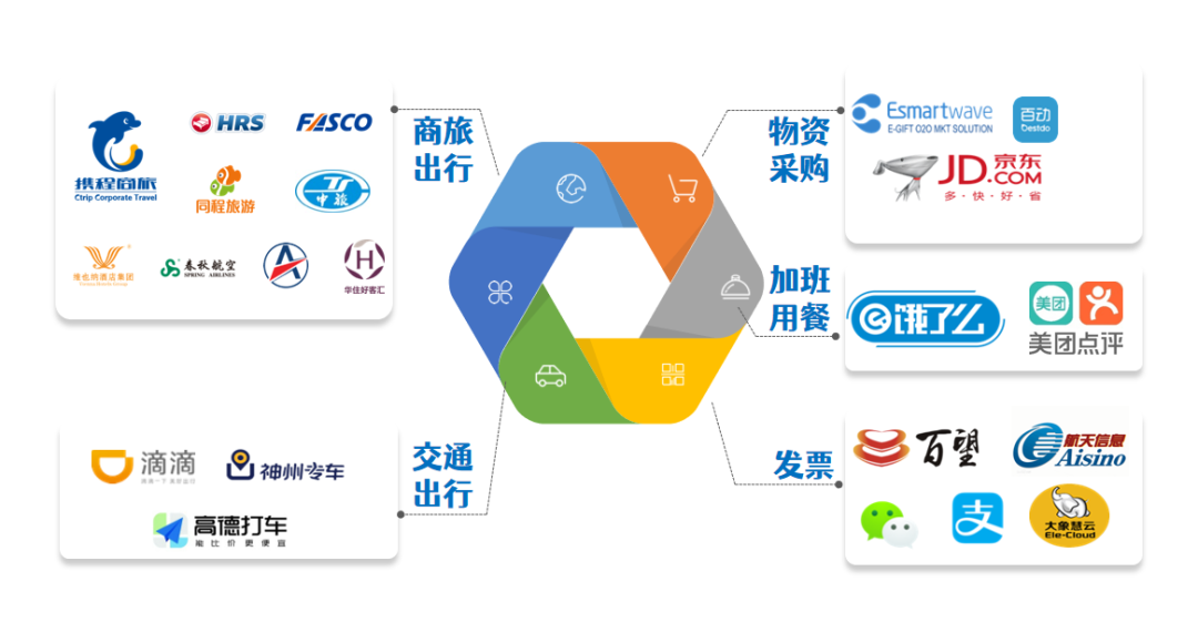 3、打通消费生态(商旅、电商采购平台等),将分散的业务流程集中管理,统一开票结算。减少流程量、发票量及档案量。