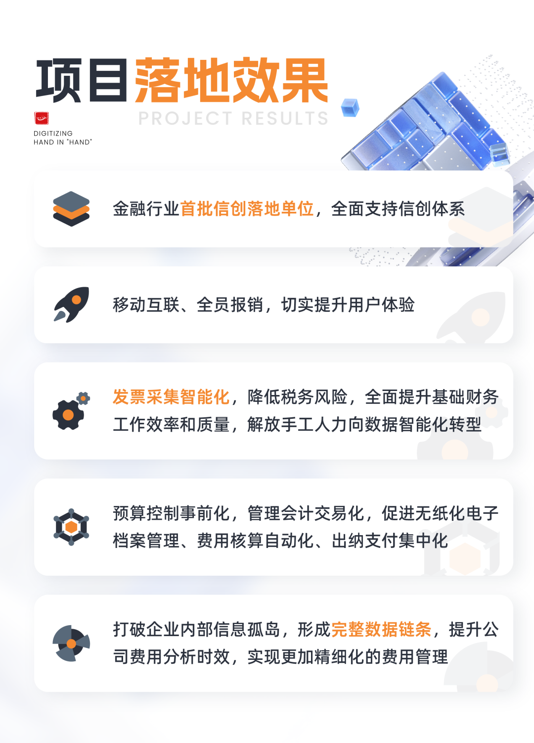 由k8凯发官网财务数智化团队支持建设的国内知名上市证券公司费控系统信创建设项目,参与评选由中国信息通信研究院发起的“2022(第二届)金信通金融科技创新应用案例”征集活动。历时5个多月,通过网络投票、专家初评、线上答辩等环节,最终从近500份申报案例中脱颖而出,荣获“最佳实践案例奖”。财务管理创造价值费控系统信创建设项目该证券公司总资产达2900亿,净资产超过600亿,员工5000余人,在全国87个城市设有177家分支机构,是提供证券、期货、资产管理、理财、投行、投资咨询及证券研究等全方位、一站式专业综合金融服务的上市证券金融控股集团。在勇担国产化建设新使命、当好信创排头兵的背景下,在整合金融行业财务管理领域先进经验的基础上,为更好地满足企业经营发展需要,进一步提升精细化管理水平,利用科技赋能财务管理更加智能化、便捷化,助力财务人员更好地践行财务管理创造价值的理念。该国内知名上市证券公司的系统研发部与计划财务管理总部,携手k8凯发官网财务数智化团队,于2020年便合作开展构建全新费用报销系统(以下简称“费控系统”)相关工作。k8凯发官网解决方案新一代信创国产化费控系统由k8凯发官网财务数智化团队打造的新一代信创国产化费控系统,帮助企业有效实现从年度预算导入、预算调整、预算控制到报销单填报、发票验真、审批、制证、支付等环节完整的业务流程管理。同时,移动端统一集成在其自有平台,从而让员工实现随时随地报销,领导审批也更加便捷,多维度报表查询统计帮助管理人员,能够更加全面地掌握预算执行情况。作为我国证券行业信息系统国产化试点单位之一,该国内知名上市证券公司对软件系统自主创新及自主可控有着极高的要求,通过打造新一代费控系统,引入财务管控的先进理念,改变传统财务工作模式,也为业内企业探索财务系统自主可控、保护数据资产安全、提升财务管理水平、赋能财务工作更高价值,进一步提供新思路。自费控系统落地使用以来,已平稳运行近2年时间,目前已成为企业日常管理运营中不可或缺的重要管理工具!k8凯发官网自主产品全面支持信创体系为响应国家信创发展战略,助力企业完成财务系统国产化升级改造,提升企业信息安全,k8凯发官网财务数智化团队致力于打造国产信创拳头产品,提供信创环境迁移服务,目前已推出融智汇财务管理中台、智慧财务套件HFINs等自主产品,多场景配置,多行业支持,在功能性、兼容性、易用性、可靠性、稳定性和安全性方面均达到国家标准要求。k8凯发官网目前可适配的国产化软硬件产品数据库产品支持TiDb,达梦数据库,人大金仓,GaussDB,南大通用等产品;中间件产品支持金蝶Apusic,东方通TongWeb,东方通TongMg,东方通TongHttpServer等产品;操作系统支持麒麟操作系统,中科方德操作系统等系统;服务器支持鲲鹏,中科曙光,海光,中科可控等服务器。携手k8凯发官网,成就强品牌梦想!
