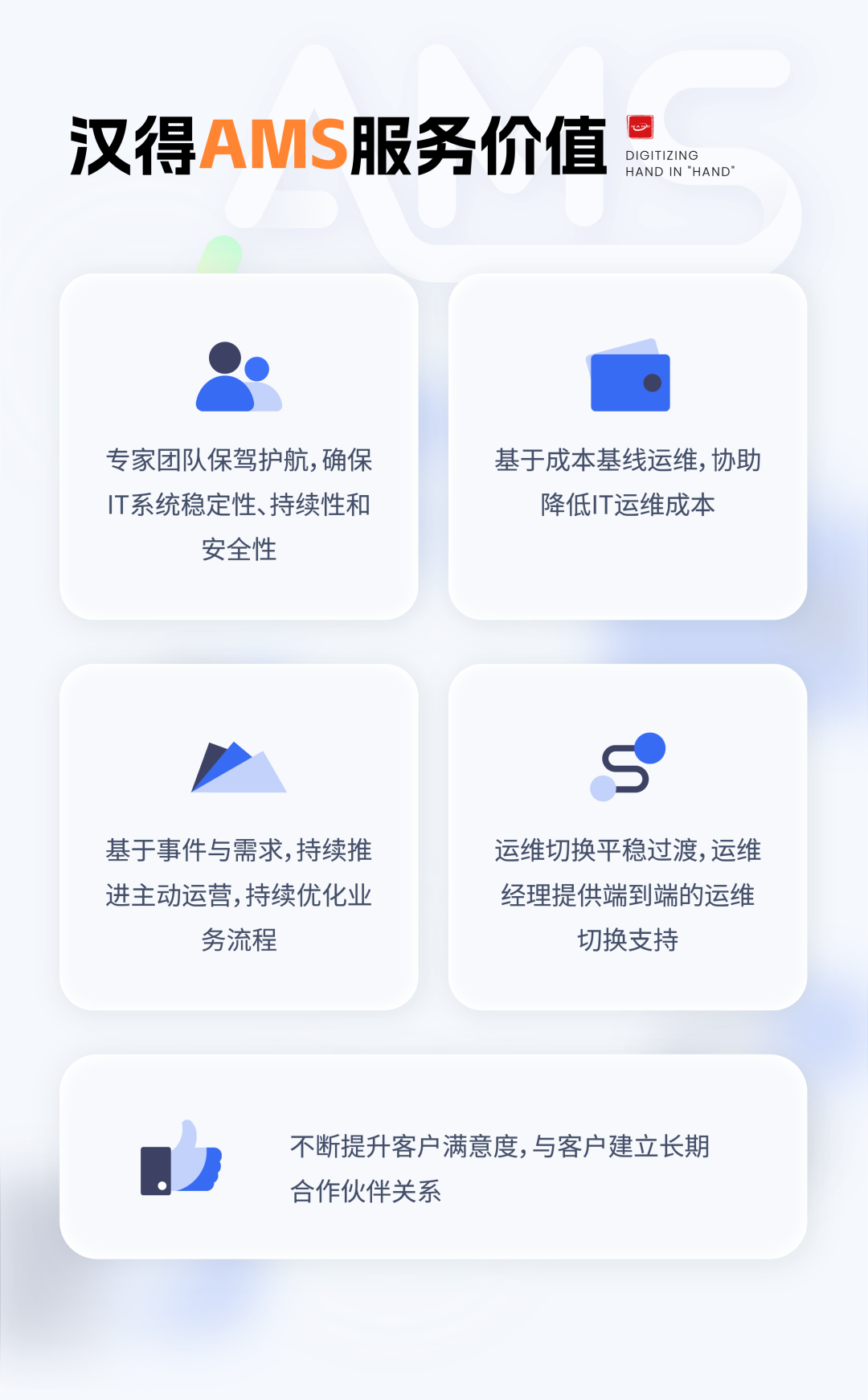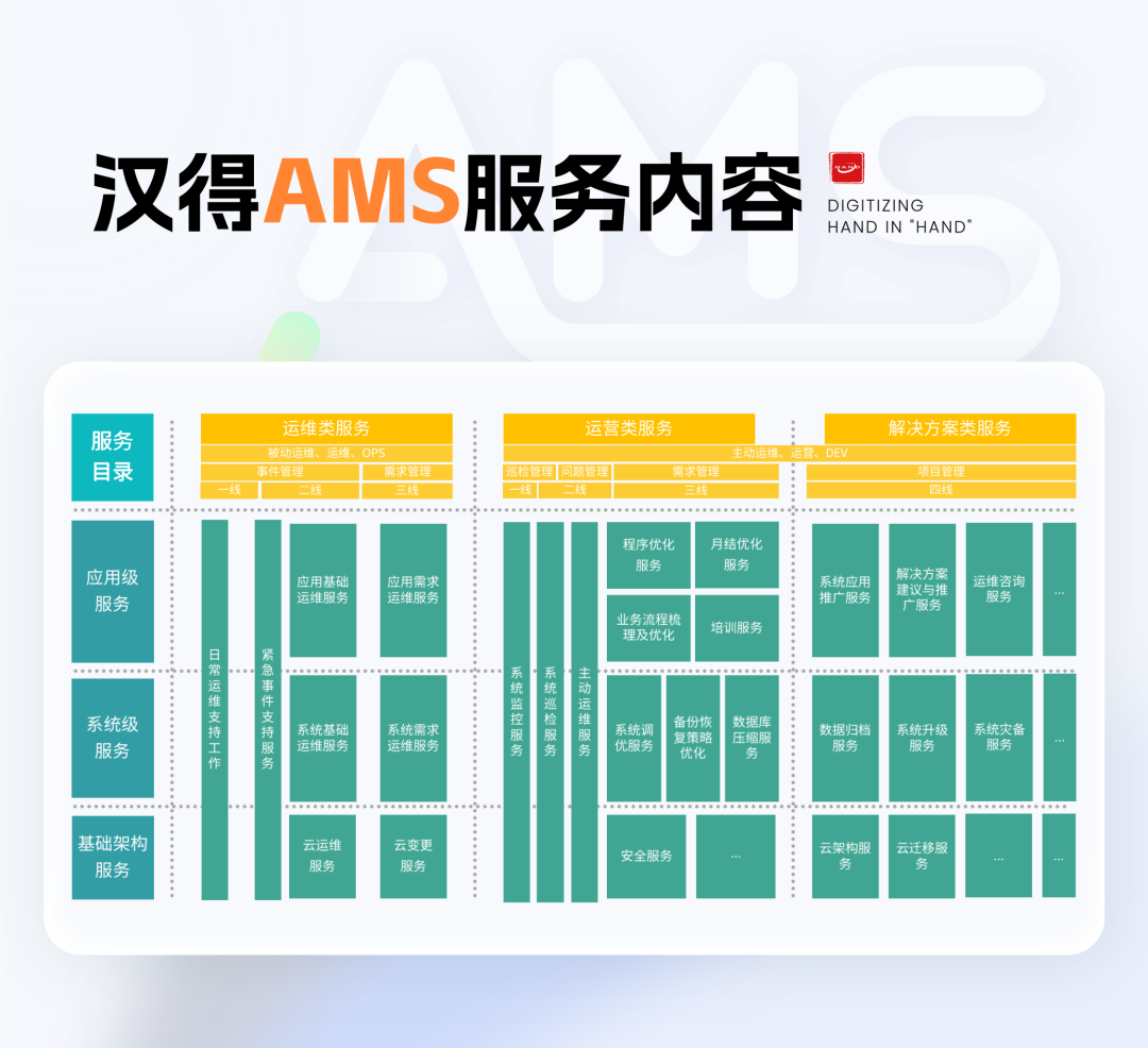 k8凯发官网AMS(应用管理服务中心)面向全球企业努力构建专业的IT系统运营中心,采用数字运营理念,区域化组织运作,自主研发运维平台,搭建完善的运维体系,给客户提供基础设施层、系统层和应用层等一站式系统运营及托管服务。