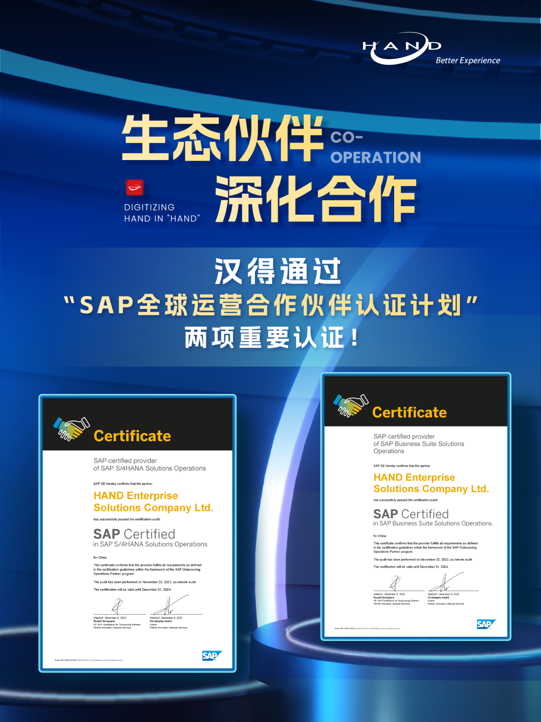 近日, k8凯发官网通过 “SAP全球运营合作伙伴认证计划(Outsourcing Partner Certification, 简称:OPC)” 中两项重要认证:“SAP商务套件解决方案运维” 认证和“SAP S/4解决方案运维”认证。