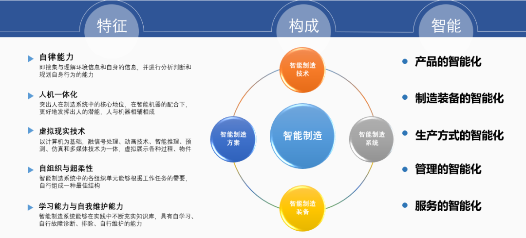 智能制造包括智能制造技术、系统、装备和服务,特点是自律能力、人机一体化、虚拟现实技术、自组织与超柔性以及学习能力与自我维护能力。