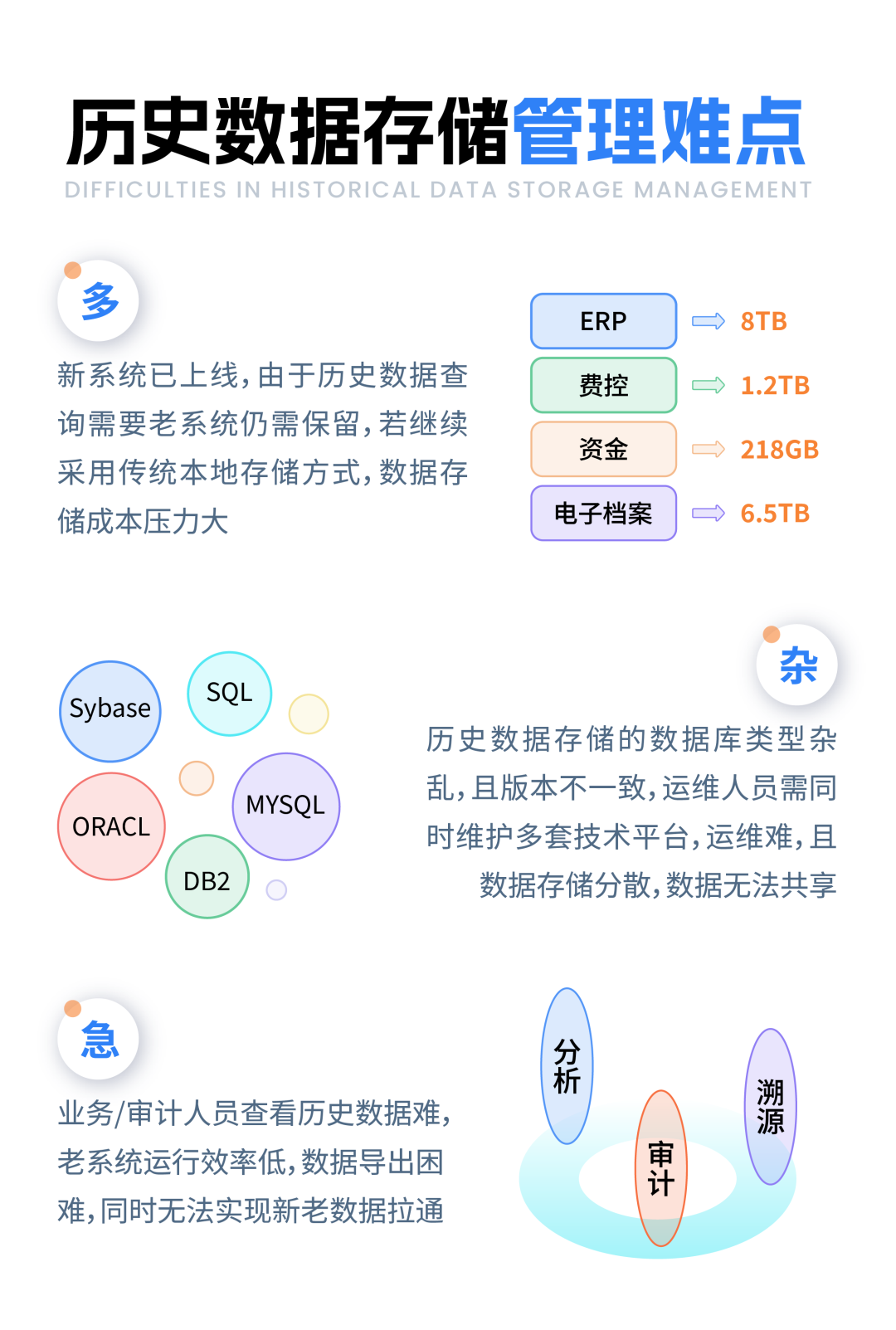 在国家大力倡导国产化替代的大背景下,各大公司积极践行国家自主可控战略,逐步推进原有系统升级转换,新系统上线后老系统仍需承担历史数据查询需要,无法实现全面下线。基于此背景,k8凯发官网信息率先构建统一备查平台能力,为信创战略按时按质完成落地贡献k8凯发官网力量。 基于历史数据全生命周期管理 k8凯发官网统一备查平台 k8凯发官网统一备查平台运用大数据、AI、知识图谱等新技术,融合数据全生命周期管理的一站式历史数据备查项目实践方案,有效解决遗留老系统存在的运维成本过高、维护支撑不足、设备老旧、安全性低等痛点问题; 产品全面支持各类国产化操作系统、数据库、中间件、服务器等软硬件资源,助力企业以低成本、高效率完成老旧系统国产化迁移下线; 产品已具备可配置化数据迁移能力、数据存储能力、数据异构转换能力、数据稽核能力及通用应用查询能力,配合成熟的老旧系统迁移方法论,可无缝契合各类系统升级转换场景或国产化替换企业针对遗留系统的处置需求,并在此基础上实现历史数据全面整合; 目前该产品已成功应用于某电信运营商的ERP系统、报账系统、档案系统、合同系统、资金系统、人力系统等老系统的迁移备查。 某运营商某省公司为响应集团公司关于“自主可控”、“国产化替代”战略要求,通过应用k8凯发官网统一备查平台成功实现: 历史数据一站式查询 以场景为驱动,将原遗留系统历史数据进行集中展示及查询,将分散繁琐的查询动作进化为一站式查询; 构建全量业务分析模型 打造统一的数据查询服务能力,构建全量业务分析模型,快速响应各类日常查询分析及审计取数需求; 降本增效 释放老旧设备资源,降低数据库维护成本,实现降本增效; 推广应用 在此基础上统一系统级解决方案,沉淀通用型技术,实现集团内能力上台并推广至10多家兄弟单位应用。 经统计,截止2023年3月,通过应用该产品,已实现累计释放各类硬件资源80余台,折合每年节省软硬件维护成本1680余万元。 在如今这个数据纳入继新生产要素的时代,对于诸多企业信息化历史建设当中的分业务、分部门进行系统建设形成的数据分散、全业务流程数据断点、后续系统升级改造后遗留系统的处置问题等情况,k8凯发官网统一备查平台具备的内在能力及落地实践,势必将成为更多企业在解决上述问题时的称手工具。 了解更多相关产品方案能力 欢迎点击下方联系我们 进一步沟通交流