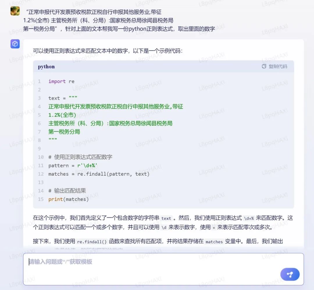 优易联RPA主流开发语言是Python,同时支持VB、JS等语言。前文审核机器人需要从完税证明备注“正常申报代开发票预收税款正税自行申报其他服务业,带征1.2%(全市)主管税务所(科、分局):国家税务总局徐闻县税务局 第一税务分局”中抽取税率“1.2%”,传统RPA通过可视化开发的方式可以实现,但比较麻烦,通过正则表达式的方式容易实现,但门槛较高。基于类似的需求,我们完全可以利用AIGC技术完成代码的编写。