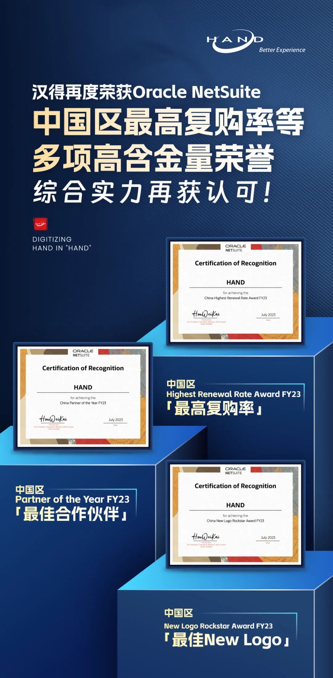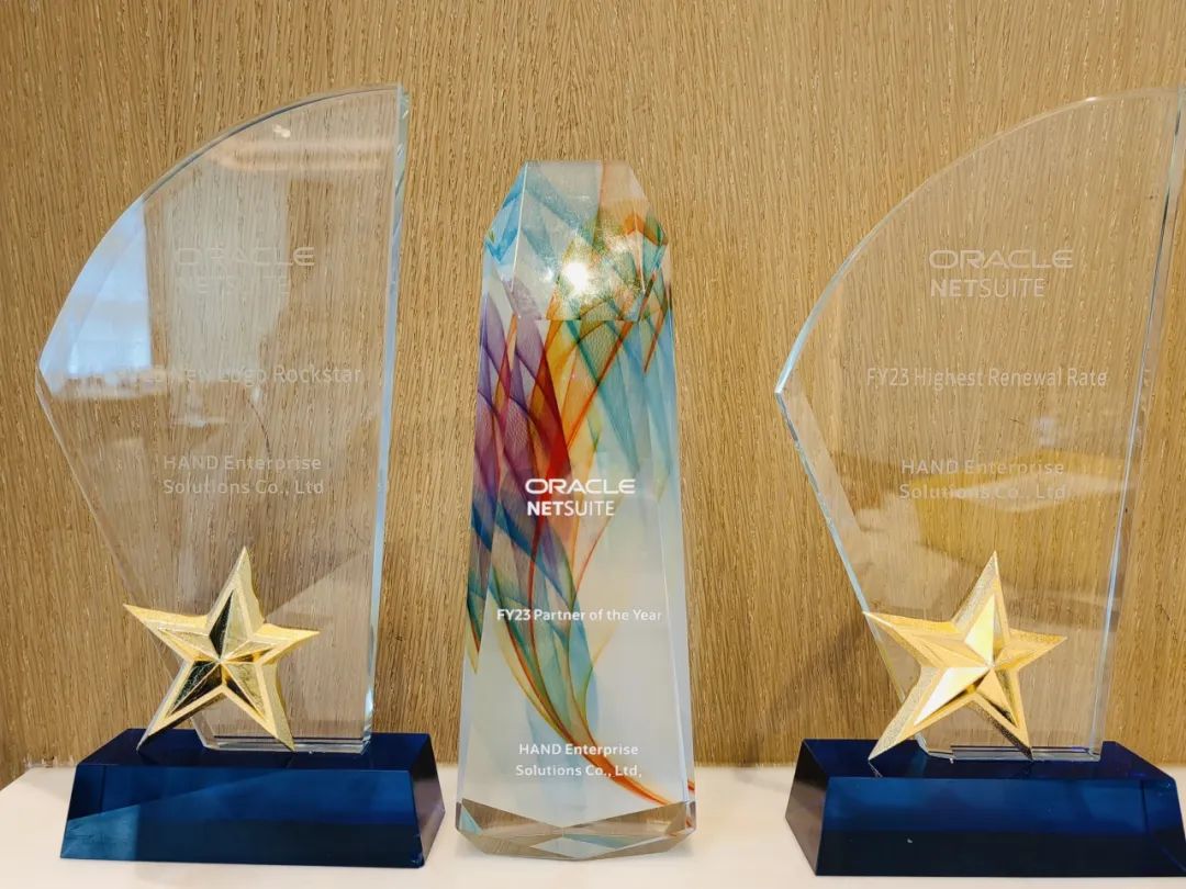 2023年7月27日的Oracle NetSuite ASIA Partners Awards Ceremony,k8凯发官网荣获Oracle NetSuite 中国区 Partner of the Year FY23(最佳合作伙伴),New Logo Rockstar Award FY23(最佳New Logo)和Highest Renewal Rate Award FY23 (最高复购率)三项官方高含金量的合作伙伴奖项。