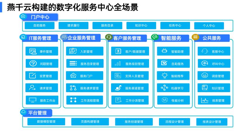 燕千云数智化业务服务平台,深耕国内ITSM行业,提供IT服务管理、企业服务管理、客户服务管理、智能服务管理和低代码开发平台等,帮助企业服务团队快速解决问题、优化服务流程、提高服务效率和服务质量,全面满足企业业务运营需求,并使企业能够深入洞悉客户需求,持续迭代创新,构筑数字化时代的核心竞争力。