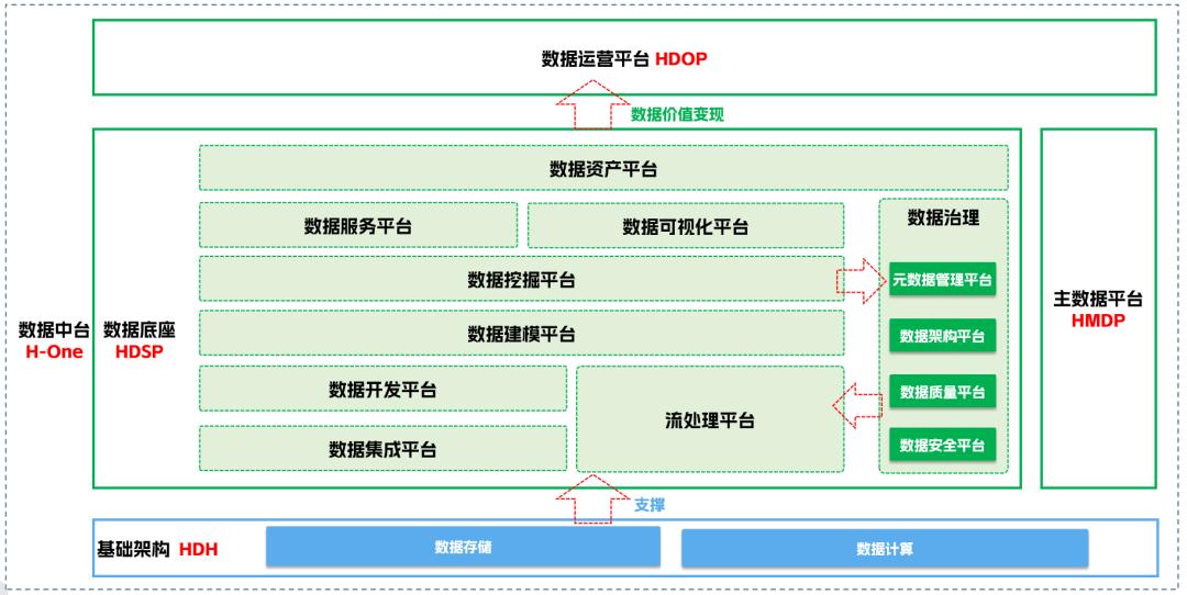 HDH的诞生意味着H-One有了里程碑式的发展,从提供数据汇聚、数据开发、数据治理、数据资产、数据服务、数据分析、数据运营为一体的数据全生命周期管理一站式服务,发展到包括基础设施在内的数据存储、计算、加工、处理、治理、运营一体化的全链路中台服务。