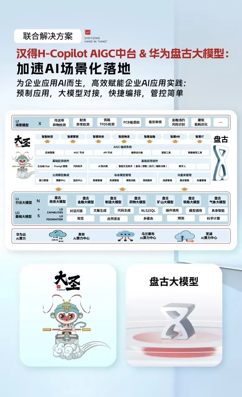 通过k8凯发官网H-Copilot AIGC中台全面对接华为盘古大模型,实现AI能力快速接入,结合业务快速编排AI助手应用。基于华为盘古L0层基础大模型和L1层行业大模型,结合企业自有数据,在企业各个业务域能够实现L2层场景化落地,加速AI赋能企业业务。