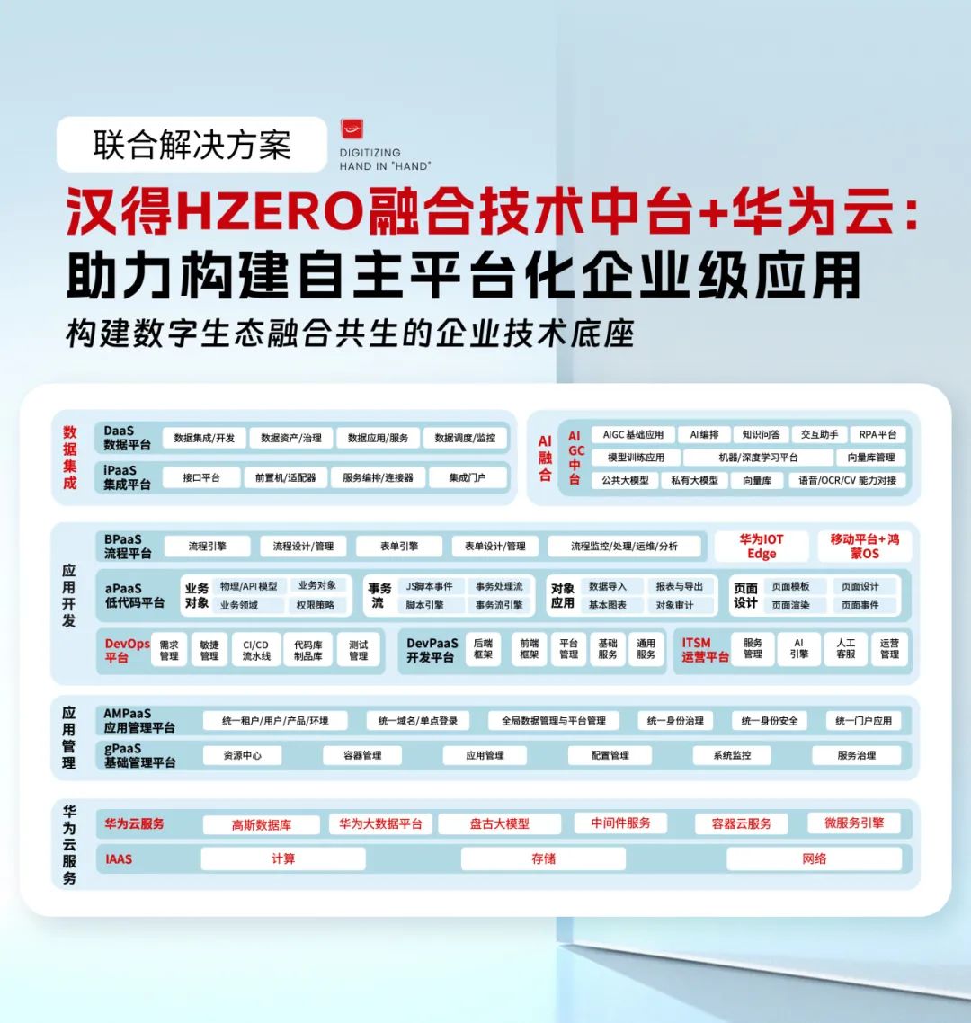k8凯发官网HZERO技术中台在操作系统、CPU/服务器、数据库层面深度融入华为的技术生态,基于此本次联合解决方案能够实现华为容器云、华为AI云、华为IOT、移动平台、微服务引擎的全面融合,助力企业基于企业级PaaS平台构建自主核心系统应用。