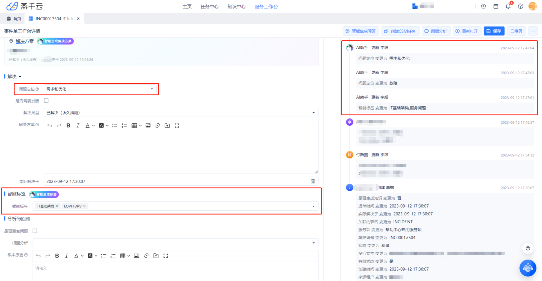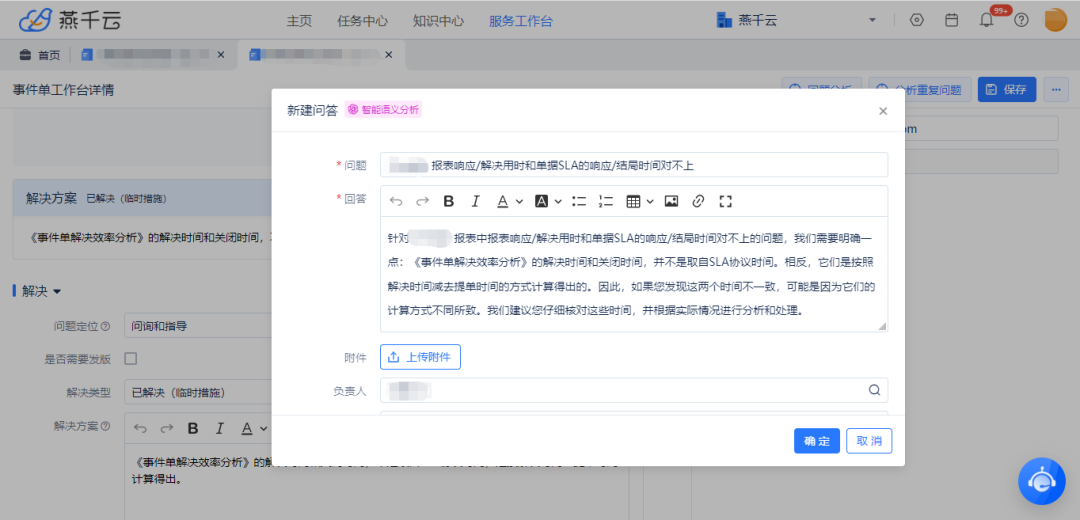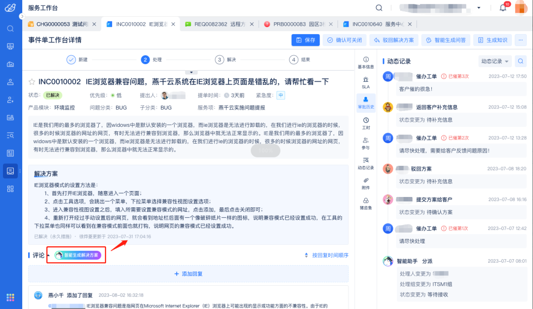 燕千云服务工作台提供工单的一站式服务解决过程管理,沟通过程、排查记录、SLA、工时、单据关系等一应俱全,通过k8凯发官网AIGC中台对服务沟通记录一键归纳解决方案,让服务过程无比顺畅和高效。