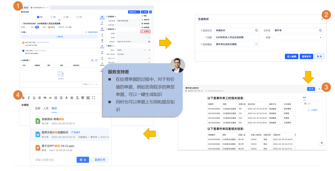 燕千云已被解决的服务单据可以一键转化为知识,实现企业在日常工作中沉淀知识的闭环流程,持续进化AIGC知识问答的能力。