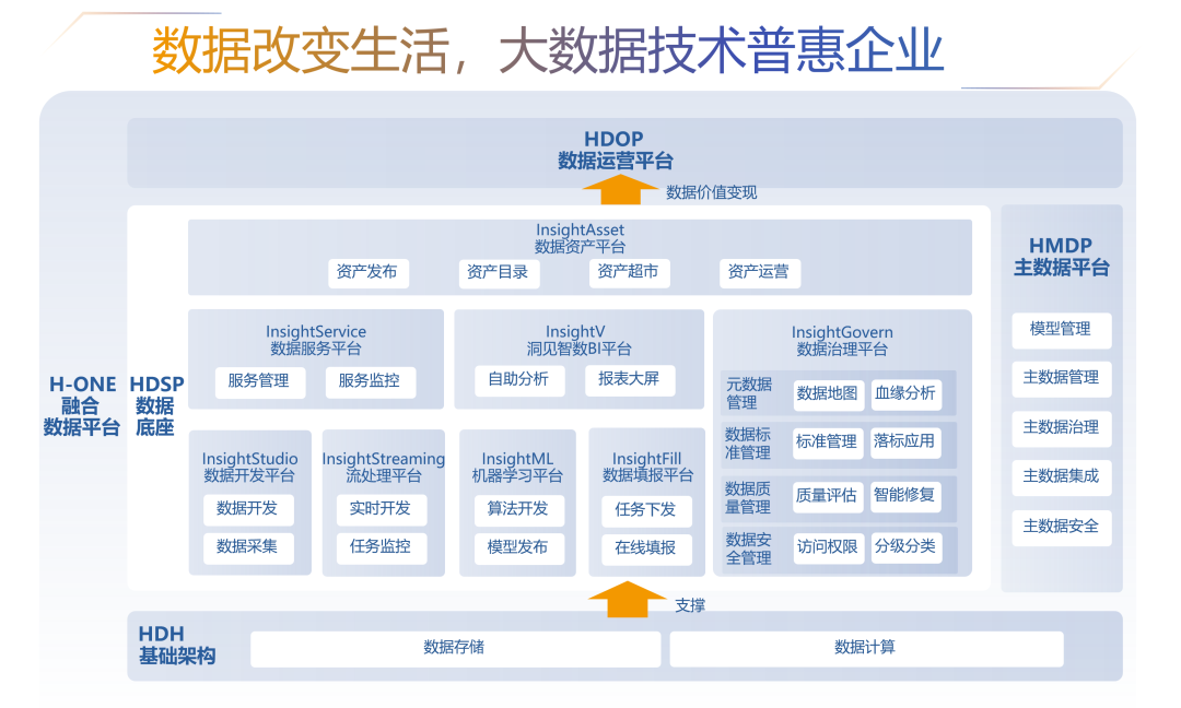 H-ONE融合数据平台包含四大一级平台,包括基础架构Hadoop发行版HDH、数据服务平台HDSP、主数据管理平台HMDP、数据运营平台HDOP。八大二级平台,数据开发平台InsightStudio、流处理平台InsightStreaming、机器学习平台InsightML、数据填报平台InsightFill、数据治理平台InsightGovern、数据资产平台InsightAsset、数据服务平台InsightService、洞见智数BI平台InsightV。