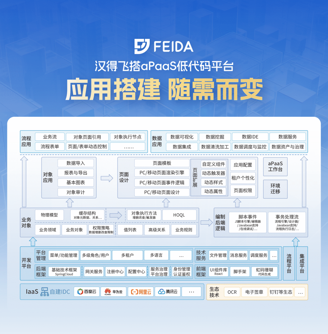 在中国信息通信研究院(以下简称“中国信通院”)开展的“数字化可信服务评估体系” 专家评审中,k8凯发官网飞搭aPaaS低代码平台(FEIDA,以下简称“飞搭”)通过《企业级低代码开发平台技术分级要求》的检验,达到增强级+要求,可为企业提升软件开发效能,低成本、高效率应对敏捷化、多样化的市场需求,加速企业数字化转型。中国信通院工信部印发的《“十四五”软件和信息技术服务业发展规划》中明确提到,“开展工业技术软件化过程的理论和技术研究,突破知识工程、低代码化等生产体系和生产关系优化的关键核心技术加强共性技术研发”。为满足各行业快速开发应用的需求,帮助企业实现降本增效、产物创新等价值,中国信通院从平台的功能完备性、易用性、平台开放度、性能优越性等维度出发,制定了企业级低代码开发平台的技术规范和通用能力标准,旨在指导企业用户选择低代码/无代码开发平台产品,以及提供低代码/无代码应用开发能力的产品或解决方案。应用构建随需而变飞搭低代码平台k8凯发官网飞搭aPaaS低代码平台,是基于低代码理念打造的融合aPaaS平台,助力企业快速搭建业务应用。作为HZERO生态的重要组成部分,致力于充分融合HZERO的各平台能力,提供企业用户在线化灵活搭建业务应用的能力,支撑企业普惠化(低门槛、高协作)、敏态化(高效率)和低成本化地快速响应市场变化,加速复杂业务场景落地。通用化的模型能力自底向上从异构数据结构管理 -> 业务对象 -> 对象API,充分释放模型能力,满足数据使用的扩展性、规范性。完善灵活的页面设计器和事件机制从页面搭建、交互事件的可视化设计,再到在线化的后端逻辑编制,为灵活多变的业务需求提供强有力的支撑。HZERO生态的无缝集成集成HZERO生态下的组件能力,功能完善且可扩展。构建SaaS体系的全方位支持全方位支持SaaS模式下构建平台共享应用及多租户管理能力。飞搭低代码平台不仅具备模型设计、应用设计、逻辑编制和对象应用四大核心能力,并融合HZERO生态体系的各项组件功能,是k8凯发官网企业数字化转型解决方案体系的重要新生力量。截止目前,飞搭已为零售、贸易、咨询等多个行业的不同领域企业提供服务,帮助企业快速构建业务应用,灵活响应需求变化。飞搭将持续迭代,不断改进和优化自身的功能和性能,以满足企业不断变化的需求。我们将积极收集用户的反馈和意见,加强与合作伙伴的合作,不断提升平台的用户体验和竞争力,帮助企业加速数字化转型。数字化,放心交给我!