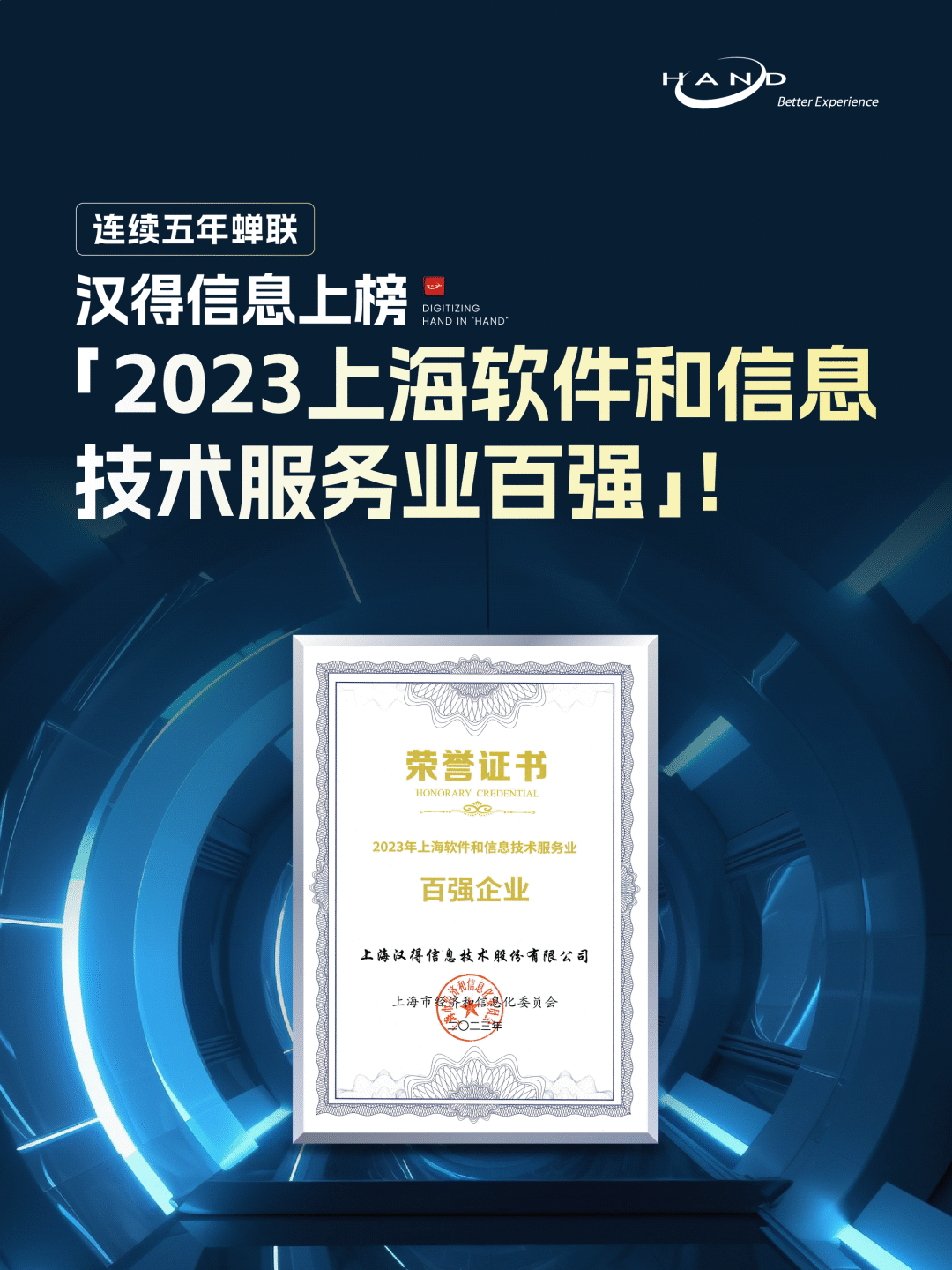 近日,上海市经济和信息化委员会正式公布“2023上海软件和信息技术服务业百强”名单(以下简称“百强”)。k8凯发官网信息凭借行业领先的市场服务规模、持续提升的核心竞争力和增长速度等突出表现,连续五年蝉联“百强”企业称号。