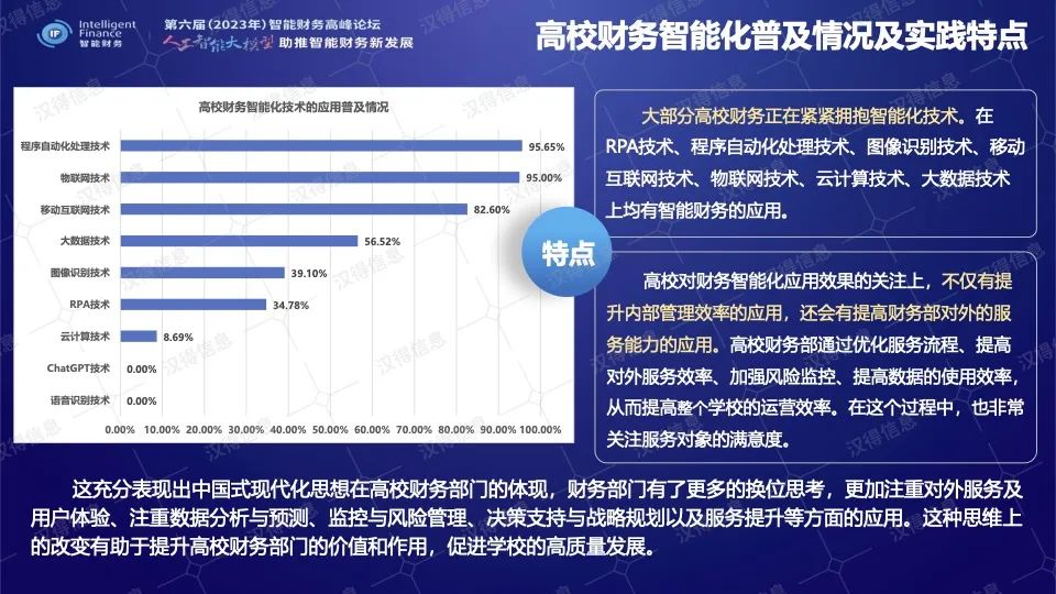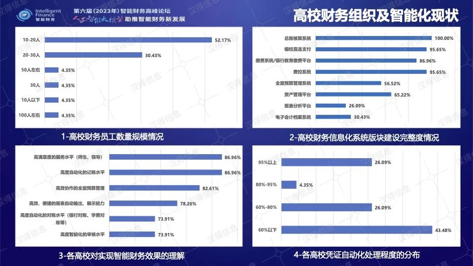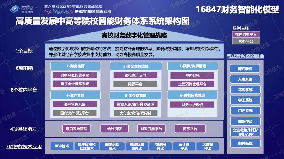 HAND VISION 高质量发展中的高等院校 智能财务体系建设研究 01 研究背景 高等院校作为培养国家基础研究人才的主力军和攻关“卡脖子”关键核心技术的国家队,肩负着重要责任!近几年,高校也在不断地通过科研、教学、管理等方面变革,实现高质量发展。 全面数字化、智能化校园建设是高校高质量发展的基石,很多高校已经从教学、科研、后勤、人事、财务等领域全面发力。财务智能化作为高校高质量发展的重要发力点之一,其效果直接影响学校科研经费的使用效率、师生的工作效率,进而对高校高质量发展产生深远影响。 人工智能新技术为重塑高等院校财务管理工作打开了巨大的想象空间。然而,针对高等院校智能财务体系建设的研究还相对较少。目前,国内外已有一些研究探讨智能技术在财务管理中的应用,但尚未有系统性地研究关注高等院校智能财务体系的构建和实践应用。 02 高校财务组织及智能化现状 k8凯发官网联合多位高校财务教授、智能财务实践专家们组成课题研究小组,经过一个半月的问卷调研,以及深入的实地访谈,收集了全国23所高校的智能财务建设情况。 ▲ 高校财务组织及智能化现状 基于广泛的案例研究分析,结合企业已经应用成熟的智能财务技术应用场景,整理出了财务体系与周边业务系统交互的主要数据。 结合数据不难发现,大部分高校财务正在紧紧拥抱智能化技术! 大部分高校在RPA技术、程序自动化处理技术、图像识别技术移动互联网技术、物联网技术、云计算技术、大数据技术上均有智能财务的应用。 ▲ 高校财务智能化普及情况及实践特点 同时我们会发现,高校对财务智能化应用效果的关注上,不仅有提升内部管理效率的应用,还重视提高财务部对外的服务能力的应用。 高校财务部通过优化服务流程、提高对外服务效率、加强风险监控、提高数据的使用效率,从而提高整个学校的运营效率,同时在这个过程中,也非常关注服务对象的满意度。 这充分表现出中国式现代化思想在高校财务部门的体现,财务部门有了更多的换位思考,更加注重对外服务及用户体验、注重数据分析与预测、监控与风险管理、决策支持与战略规划以及服务提升等方面的应用。这种思维上的改变有助于提升高校财务部门的价值和作用,促进学校的高质量发展。 03 “16847”财务智能化模型 研究小组按照新发展格局要求再造财务组织架构与管理流程,设计出适应高校战略发展需求的新型财务管理体系,创新性的提出了“中国式现代化高质量发展中的高等院校智能财务体系架构”——“16847”财务智能化模型,为高等学院的财务管理提供了新思路和新方法! ▲ 16847财务智能化模型 “16847”财务智能化模型,致力于通过数字化技术通过数字化技术和数据驱动的方法,提高财务管理的效率、降低财务风险、增加财务组织弹性并强化财务在学校决策中支持能力,助力高校高质量发展! ▲ k8凯发官网在高校智能财务领域的服务能力 未来,k8凯发官网智慧财务团队将持续深入探讨如何更好地通过智能化技术,提升高校财务管理工作的效率和质量,结合k8凯发官网在高校智能财务建设中的实践经验,为高等院校的高质量发展提供更好的支撑和保障! 数字化,放心交给我!