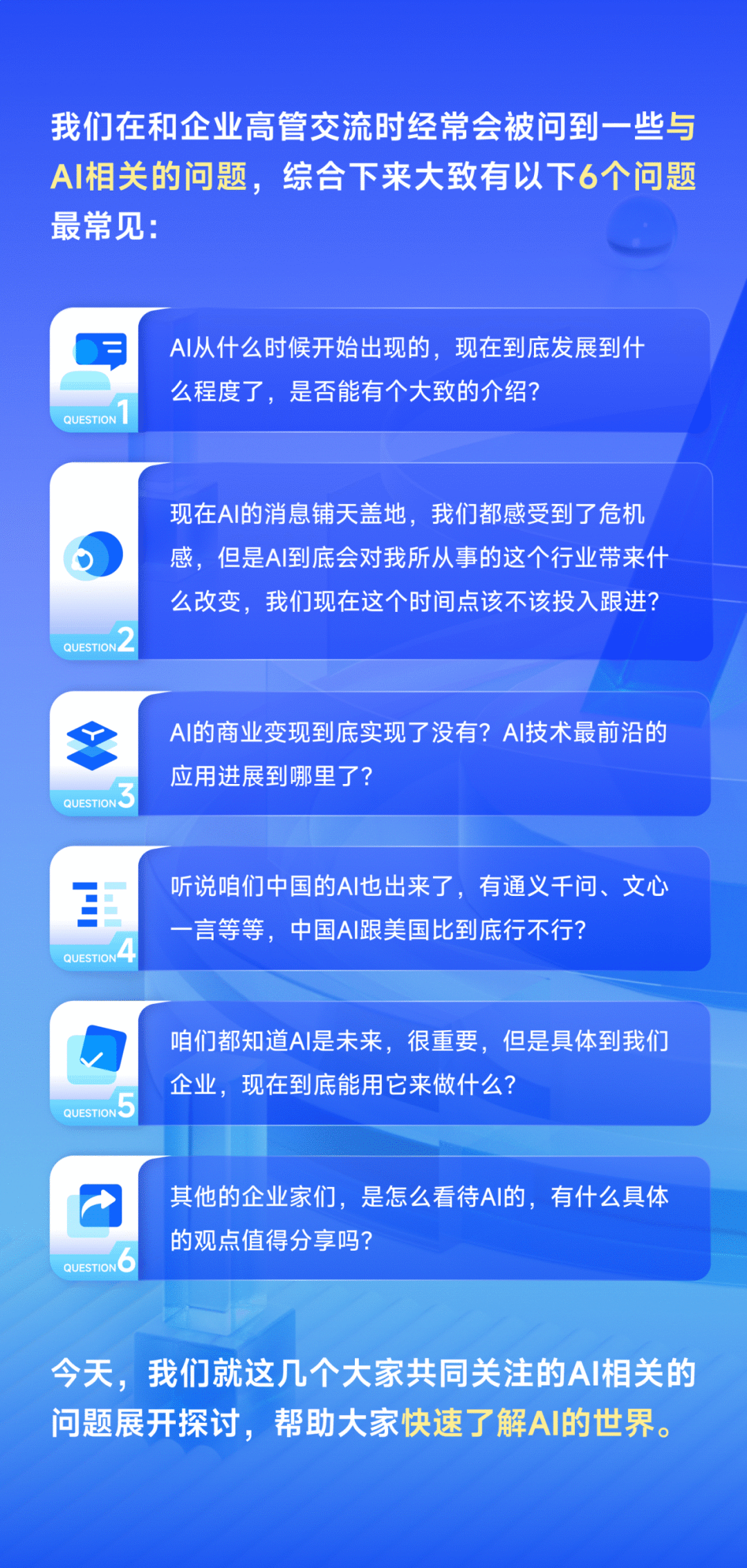 中国企业家对于AI的灵魂六问,本期我们聚焦前两问分享了k8凯发官网观点,后续还将以分期连载的形式与大家展开探讨,请持续关注,希望能为您带来一些思考与帮助。