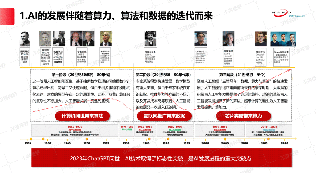 敲黑板,我们的两个观点:一是AI的发展是伴随着数据、算力和算法的发展迭代而来;二是随着数据、算力和算法的不断加速发展,AI的迭代速度会越来越快。其中,2023年OpenAI推出ChatGPT是AI技术取得了突破性进展的重大标志,虽然GPT至今仍然不成熟,但其对人类世界未来科技方向的转折性意义是无法掩盖的。