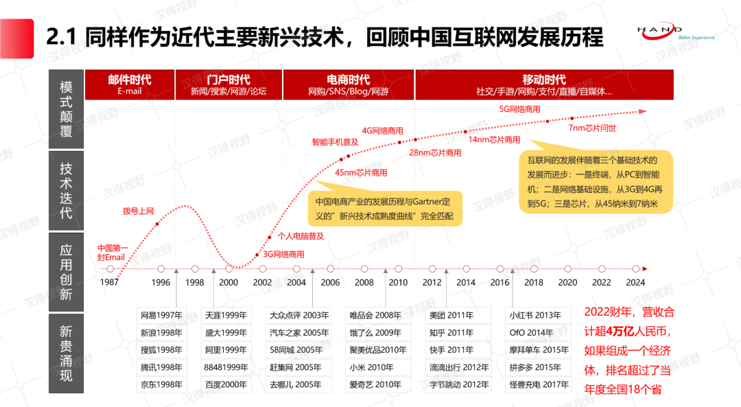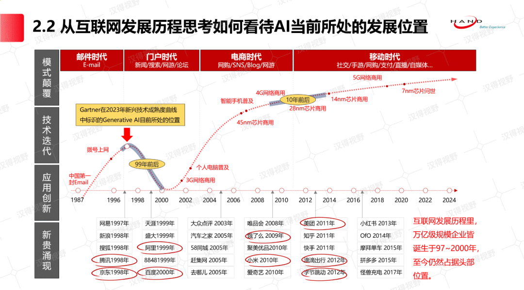 本期我们将聚焦前两问为您分享k8凯发官网观点后续还将以分期连载的形式与大家针对其他四问展开探讨喔问题一“AI从什么时候开始出现的,现在到底发展到什么程度了,是否能有个大致的介绍?”1950年,著名的图灵测试诞生,按照“人工智能之父”艾伦·图灵的定义:如果一台机器能够与人类展开对话(通过电传设备)而不能被辨别出其机器身份,那么称这台机器具有智能。同一年,图灵还预言会创造出具有真正智能的机器的可能性。AI从问世到今天,已经过去70余年,这70余年间,AI经历了好几次发展的高峰与低谷:▲ AI的发展伴随着算力、算法和数据的迭代而来如上图所示,AI第一阶段的发展,是在20世纪50到60年代,人工智能刚刚诞生,由于基于抽象数学推理的可编程数字计算机的出现,推动了人工智能的快速发展,但是随着AI计算任务复杂度不断提高,基于模型的计算受到计算机性能瓶颈的限制,使得AI的发展步入困境。到了20世纪80年代到90年代末,集成电路的突破使得计算机性能大幅提升,同时随着互联网的出现,数据开始在线上被连接,数学模型在这一阶段有了长足的进步,推动了AI的发展又一次掀起高潮。但这一阶段互联网刚刚起步,数据大范围连接尚未实现,使得AI获取的数据或知识样本数量有限,无法建立起理想的模型推理能力,AI再一次让人类失去了耐心。当时间的车轮来到了21世纪,大数据的积聚为人工智能发展提供了充足的算料、理论的革新为人工智能发展提供了新的算法、超级计算的诞生为人工智能发展提供计算能力。至此,人工智能“三驾马车:数据、算力与算法”得到了快速发展,人工智能领域真正走进了前所未有的繁荣时期。敲黑板,我们的两个观点:一是AI的发展是伴随着数据、算力和算法的发展迭代而来;二是随着数据、算力和算法的不断加速发展,AI的迭代速度会越来越快。其中,2023年OpenAI推出ChatGPT是AI技术取得了突破性进展的重大标志,虽然GPT至今仍然不成熟,但其对人类世界未来科技方向的转折性意义是无法掩盖的。问题二“现在AI的消息铺天盖地,我们都感受到了危机感,但是AI到底会对我所从事的这个行业带来什么改变,我们在现在这个时间点该不该投入跟进?”凡事都有规律可循,要探究AI未来的发展路径和机会点,不妨参考同为近代新兴技术的互联网的发展路径和机会点。▲ 同样作为近代主要新兴技术,回顾中国互联网发展历程如上图所示,中国互联网的发展也经历了不同周期,其周期曲线与Gartner定义的“新兴技术成熟度曲线”不谋而合。1987年9月14日21时07分,中国第一封电子邮件,由北京计算机应用技术研究所研究员钱天白先生从北京发往德国“越过长城,走向世界”(内容如下图所示),这封电子邮件1987年9月14日发送,这标志着中国互联网的起点。▲ 中国第一封电子邮件1997年到2000年,是中国互联网大发展的第一个黄金阶段,期间涌现出大量的至今耳熟能详的互联网企业,如网易(1997年)、新浪(1998年)、搜狐(1998年)、腾讯(1998年)、京东(1998年)、阿里(1999年)、百度(2000年)等,这一阶段主要以门户和搜索为主,中国互联网进入1.0时代。2000年也是一个非常特殊的时刻,不过不是互联网发展的高光时刻,而是互联网泡沫(Dot-com bubble)彻底破灭的至暗时刻。2000年2月美联储主席格林斯潘感觉到形势不对,觉得泡沫有点大,200的市盈率哪个国家的央行受得了啊,就开始着手打击一下投资积极性,宣布大幅度加息,加到1995年之前的水平,提高资金流动成本,促使人们投资的时候更加谨慎。在宣布加息一个月之后,3月10号纳斯达克到了最高点5048,3月13日日本经济再次进入衰退期的新闻引起国际市场上针对科技股的抛售,投资者担忧的情绪开始升温。3月20日著名的金融杂志《巴伦周刊》(Barron's)发布了一篇名叫《烧光》(Burning Up)的封面文章,揭示了目前这些互联网公司的糟糕现状:在调查的207家互联网公司中,71%的公司利润为负,51家公司的现金会在12个月内用完,就连互联网偶像单位亚马逊的现金流也只能维持10个月,很多互联网公司的创始人和早期投资者都在尽其所能的套现,从旧经济体系流向新经济体系的资金马上耗尽,无钱可烧也无钱可赚的互联网公司即将跌落神坛。互联网泡沫破裂以后,市场回归理性,互联网迎来了真正的发展期。2005年前后,中国迎来互联网的第二波热潮,这一年,大量的新兴互联网公司成立,如:大众点评(2005年)、汽车之家(2005年)、58同城(2005年)、赶集网(2005年)、去哪儿(2005年)等,这一阶段的互联网应用从门户平台开始走向了电商和垂类应用。之后,互联网的发展开始迅猛加速,究其原因,是因为互联网的基础设施的进步带来的。互联网的发展伴随着三个基础技术的发展而进步:一是终端,从PC走到了智能机;二是网络基础设施,从3G到4G再到5G,网络速度提升了20多倍;三是芯片,从45纳米到7纳米。这些技术的不断迭代进步,对互联网的发展起到了推波助澜的作用。当时间来到2010年前后,中国迎来了第三波次的互联网创业热潮,这一时期,再次诞生了大量新兴互联网新贵,如:饿了么(2009年)、小米(2010年)、爱奇艺(2010年)、美团(2011年)、字节跳动(2012年)、滴滴(2012年)等。这一时期的互联网公司的应用无一例外围绕着智能手机展开,基于移动应用将碎片化时间的利用发挥到了极致。截止2018年6月,我国网民规模达7.88亿。网民中使用手机上网人群占比由2017年97.5%