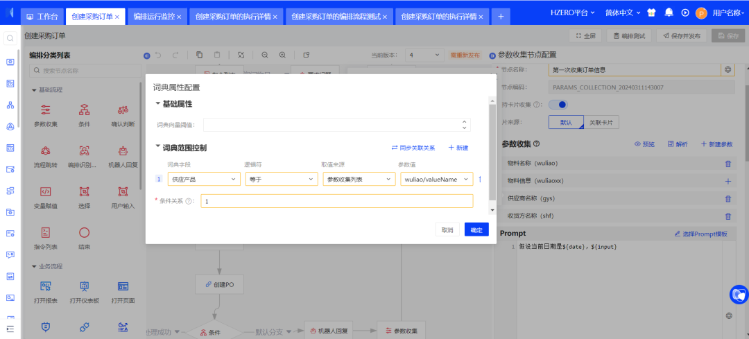 在参数收集节点中选择词典后,可通过词典范围控制进行数据级联控制,例如可根据用户选择的业务实体不同,“供应商”和“物料”展示的可选项不同。