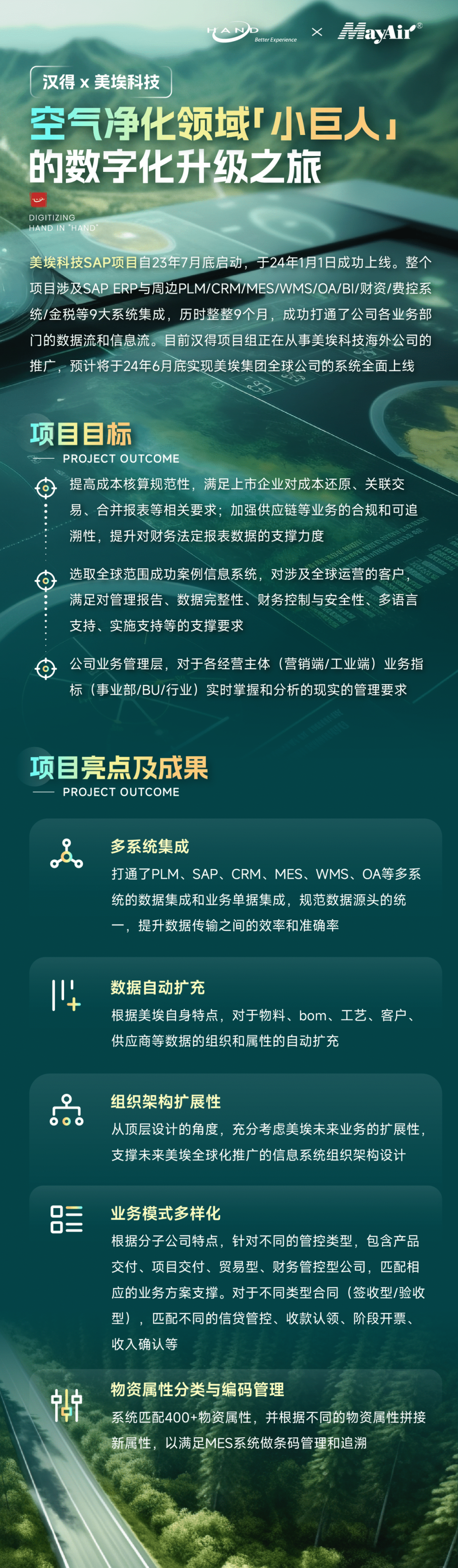 大国制造 云端焕新美埃科技数字化升级近日,2024 SAP 专精特新高峰论坛在南京顺利召开。本次会上,美埃科技等三家南京市重点行业的领军企业分别从生产制造、供应链管理、财务合规、销售服务及可持续发展等方面进行了深度分享。作为SAP的金牌合作伙伴,k8凯发官网SAP事业部华东事业部高级经理丁亮受邀在活动现场为大家带来「美埃科技SAP全球化项目」的案例分享,详细地展示了k8凯发官网是如何通过整合统一的SAP平台帮助美埃科技推进SAP ERP与BPC项目,最终助力美埃科技实现了财务管理与经营分析的高度集成,并为其未来的集团化财务战略和业务扩展打下了坚实的基础。▲ k8凯发官网信息SAP事业部华东事业部高级经理丁亮美埃科技美埃(中国)环境科技股份有限公司(688376) 创立于2001年,深耕高等级空气净化领域,专注于半导体洁净室环境技术及产品的研发、制造、销售和服务,并应用于生物安全GMP制药和医疗健康,商用人居健康环境、餐饮油烟大气排放治理等领域。产品有介质过滤器、化学过滤器、静电过滤器、FFU风机过滤单元、生物安全无菌净化设备、医用消毒净化设备、商用家用空气净化机、餐饮油烟净化设备、工业废气排放净化系统等,产品及技术应用于各行业空气净化领域。公司总部坐落于南京,在全球布局9座生产基地(南京3座、中山、成都、天津、无锡、马来西亚、加拿大)及4座研发中心(中国、日本、马来西亚、加拿大),并建立庞大的销售服务网络,制造中心总面积超5万平米,现已成为国内空气净化行业较大的供应商。美埃科技近年来发展势头迅猛,然而其原有的ERP系统却因为底层架构老化,无法满足公司财务精细化核算及全球化管控等战略需求,导致公司饱受无法支撑多语言、月结速度慢、接口不稳定等痛点的影响;同时公司层面的合并报表和管理内报仍需要人工手动录入,不仅造成较大的成本支出,结果准确率和及时性也无法得到保障。为实现降本增效,推进企业的高质量发展,公司管理层经过慎重考虑,最终决定携手k8凯发官网启动SAP ERP项目,通过重新梳理研产供销业务链的拉通,以达成高度的业财一体化及经营数据自动化的管理目标!作为资深的企业数字化综合服务商,k8凯发官网结合美埃科技的实际状况,明确提出三大项目目标,并为其制定了详细精准的解决方案。不仅助力美埃科技实施优化了多个模块系统,还实现了多系统集成、组织架构扩展、业务模式多样化等多个目标!本次项目的落地也为美埃科技带来五大优化。优化1: 组织架构总体设计标准化推行 -> 可扩展打造统一的数据平台,将所有公司数据统一管控,支持多语言登录,财务管理及经营分析统一,便于未来集团化财务控制。优化2: 业务模版固化支持未来并购等集团型拓展 根据各法人公司的具体定位(财务管控型/战略管控型/运营管控型)和当前发展阶段,判断当前所用到的业务模式,系统在设计时,不同业务模式也有不同的管控方式。一家公司可以有多个业务模式类型,如美埃中国,既满足产品交付模式,也满足项目交付模式。优化3: 集团主数据标准化搭建集团通用的物料主数据数据标准化体系。PLM搭建一套标准BOM,下发SAP各不同工厂后生成工厂BOM,减少中间沟通环节,降低抛转不可控因素,高效便捷。将工作中心工艺路线颗粒度精细化。优化4: 核心业务改变点在交货单环节对客户信用进行管控,降低企业经营风险。制定替代料方案,在SAP中自开发替代料程序来解决替代料问题。制定外协业务方案,将有料号和有BOM构成之外的业务委外。优化5: 统一性报表输出凭证自动输出 统一的报表平台:通过BPC自带的EPM插件,可实现与OFFICE完美结合的客制化EXCEL格式报表。灵活的维度分析:通过BPC灵活的EPM分析功能,财务可进行灵活的多种数据分析。在本次合作中,美埃科技在数字化升级后所展现出的卓越表现给我们留下了深刻的印象,也让我们愈发坚信专精特新企业在数字化转型的道路上还存在更多值得探索的潜力和可能性。k8凯发官网作为企业数字化综合服务商, 始终致力于成为连接企业管理与数字化技术的桥梁,我们也期待能够与更多专精特新企业携手共进。同时,k8凯发官网也将不断提升自身的交付质量和效率,努力为客户提供更优质、更高效的数字化服务,助力企业在激烈的市场竞争中脱颖而出!