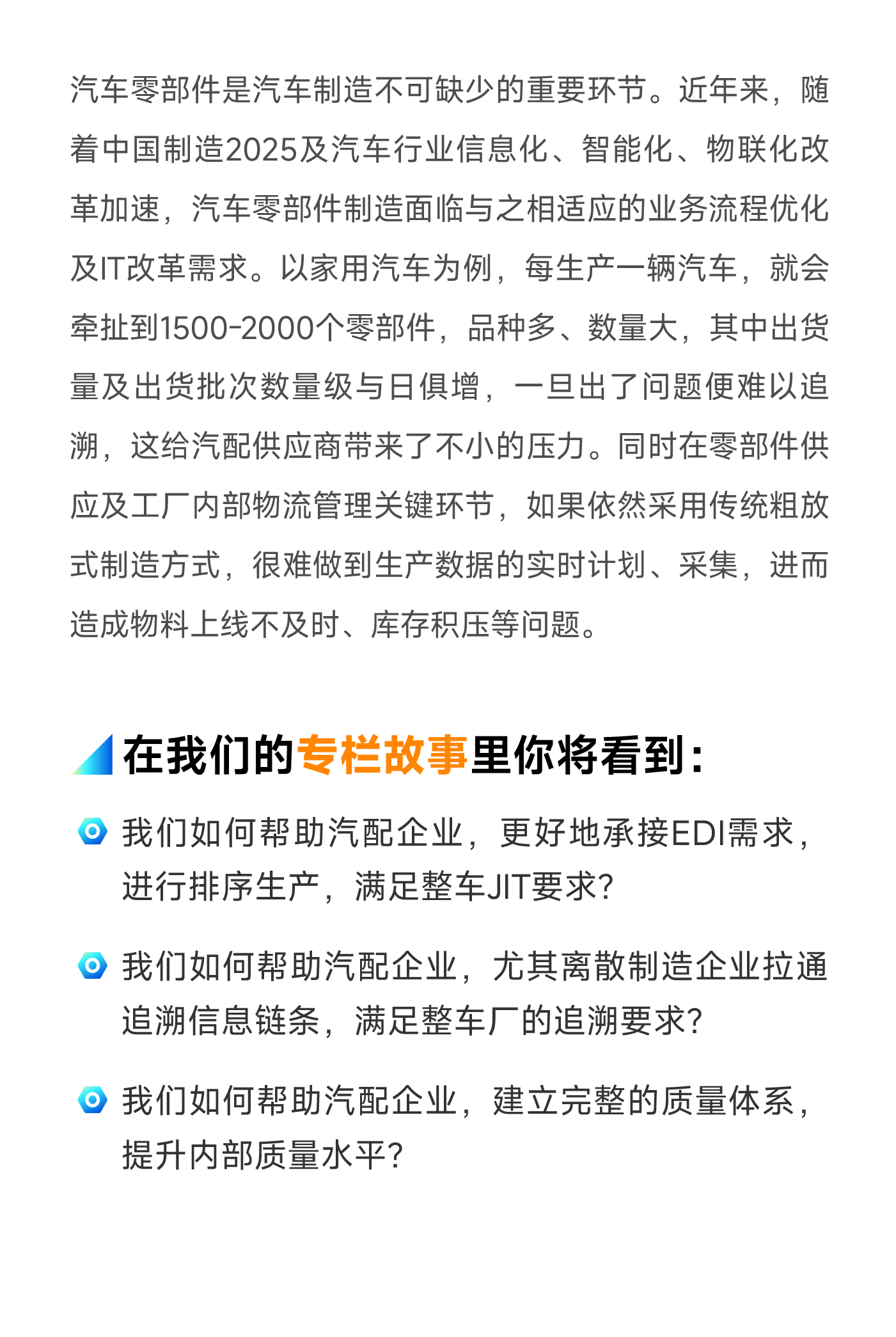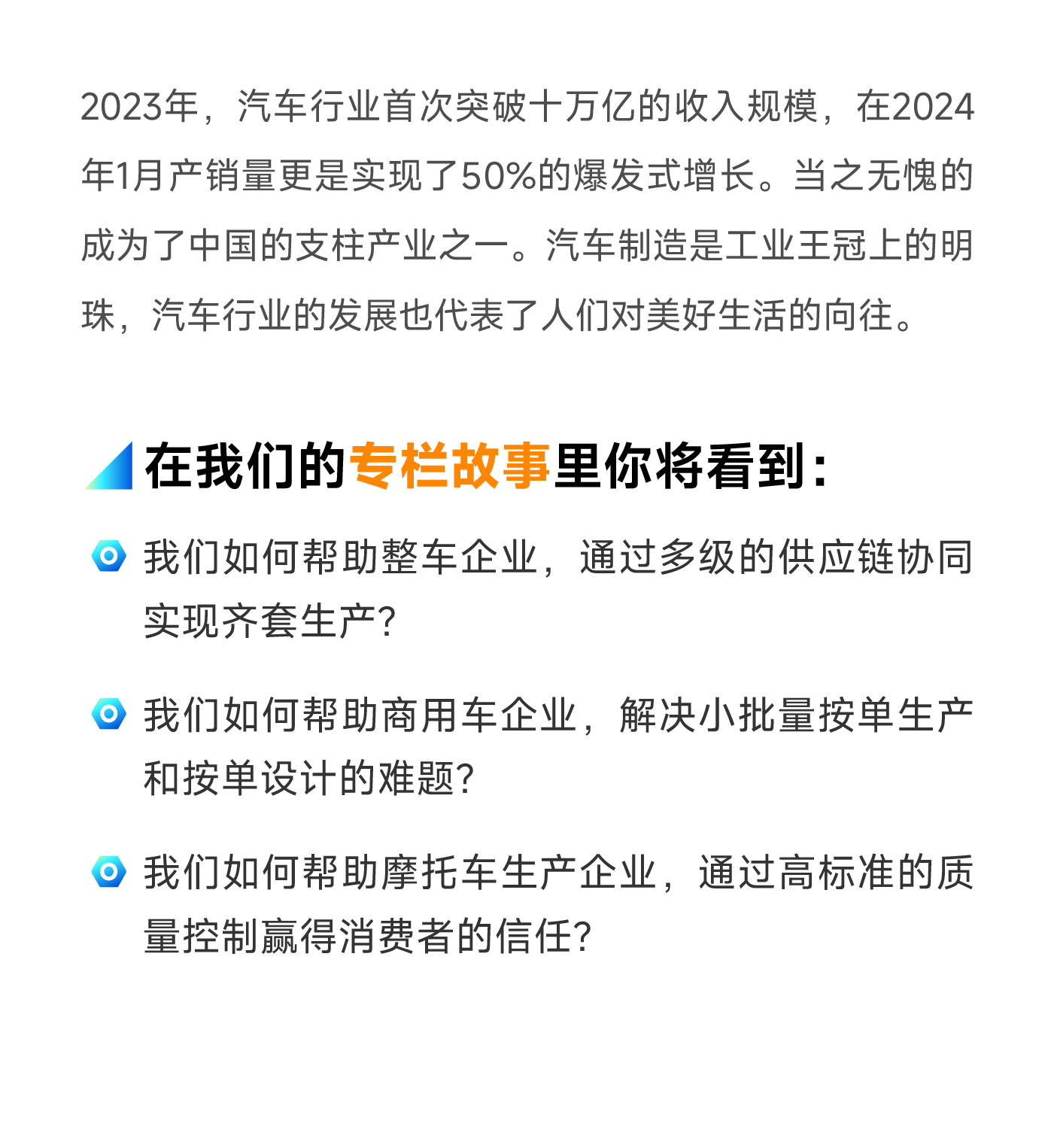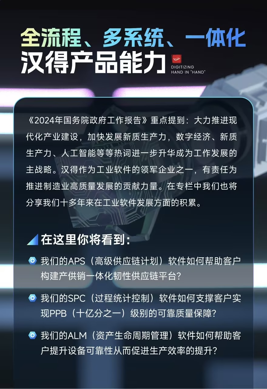 质胜未来 英雄之旅 随着发展数字经济的深入推进,数字产业化和产业数字化的浪潮扑面而来,以实现智能制造为目标的制造业转型升级已经成为了中国制造业的全面共识。经过大量企业多年来持续不懈的探索和实践,智能制造的图景逐渐清晰地呈现在大家面前,在这个过程中,各行各业以数字化、网络化、智能化为目标的应用场景如雨后春笋般大量涌现。然而智能制造之旅对所有企业来说都绝非一帆风顺,对于中国制造业来说通过智能制造构建面向全球市场的竞争力,是突破当前重重困境的必由之路。在一段段“英雄之旅”中,大家是如何思考的?大家都遇到了什么困难,又是如何解决的?许许多多具体生动的故事需要被讲述,因为这些鲜活的例子能帮助更多同行者找到前进的方向。同时,他山之石可以攻玉,不同行业的经验也能为所有人提供思考当下问题的不一样视角。k8凯发官网作为中国工业管理软件的领军企业之一,多年来已经为全球数百家工厂提供以供应链计划、APS以及制造执行系统为核心的数字工厂解决方案。我们始终将通过数字化和智能化技术,帮助中国制造企业实现效率驱动下的产品领先、成本领先,构建在全球市场的卓越竞争力作为我们不变的目标。制造企业数字化的成败在于数字化工具能否真正帮助企业解决业务问题,贴合企业实际,聚焦业务场景也成为了k8凯发官网能在激烈的市场竞争中形成独特竞争力的重要原因。因此k8凯发官网特别推出「数字劲动力,‘智’造塑未来」专栏,我们希望将k8凯发官网与客户共同的故事分享出来,让更多的企业理解数字化,了解智能制造,为中国制造业的高质量发展,为新质生产力的发展贡献k8凯发官网力量。讲述中国制造数字化故事智造专栏导览制造企业的数字化发展具备明显的行业化特征,k8凯发官网智能制造业务的发展始终把行业化和专业化作为核心战略。所谓“水有多大,鱼有多大”,中国领先的制造业孕育在中国万亿级的产业之中,因此我们选择万亿的行业作为我们专业服务的主阵地。在与这些行业头部企业长期合作过程中,我们见证了数字化帮助这些优秀企业持续提升效率,从而推动行业的高速发展,因此我们对数字化的力量深信不疑!经过多年的积累,k8凯发官网在行业深耕上硕果累累,特别在新能源、车生态和泛家居等领域形成了自身独特优势,赢得良好的口碑。据IDC报告显示,k8凯发官网MES在中国制造业整体及新能源/汽车整车/汽车零部件/装备制造/家电等众多细分行业市场份额名列前茅。我们的制造企业数字化故事分享也将以行业作为立足点,通过访谈内外部专家及领先企业、专题直播及文章等等多形式开展。在我们的智造专栏里您将会看到以下内容点击以下图片带你提前剧透“全流程、多系统、一体化”是企业业务数字化的基本要求,而这一目标需要统一的技术平台和可扩展的应用软件来承载。18年前,我们以实现全面的业务集成为理念开始构建我们的自主产品,经过18年的持续深耕,我们现已拥有完全自主知识产权的MOM系统——k8凯发官网协同制造平台(HAND Collaborative Manufacturing suits,HCMs),能够为制造企业的数字化工厂建设提供一站式服务能力。基于k8凯发官网融合技术平台H-ZERO,HCMs能够与k8凯发官网生态的成熟套件和丰富解决方案快速集成,支撑企业打造端到端一体化的数字化运营平台。HCMs已具备覆盖全价值链的完整业务模块,能够帮助我们的客户快速搭建制造领域数字化的主干线。同时基于数千个成熟API,我们还能够帮助客户快速构建和迭代业务场景,有力支撑企业业务流程的变化和业务规模的快速发展。k8凯发官网在产品研发方面一直紧跟技术前沿,让蓬勃发展的AI能力赋能制造业,是我们产品发展的重要使命,通过与头部客户共同探索,一些具有勃勃生机的“AI+”制造的应用场景正在浮现,未来在我们的行业故事中大家将看到它们的身影,了解到AI是如何一点点改变着生产现场!千里之行始于足下,行胜于言。第一期新能源行业专题即将上线,我们将与您分享新能源行业的数字化故事、k8凯发官网行业洞察,还有资深专家及领先企业进行现场分享,更多精彩内容欢迎大家持续关注「数字劲动力,‘智’造塑未来」专栏。