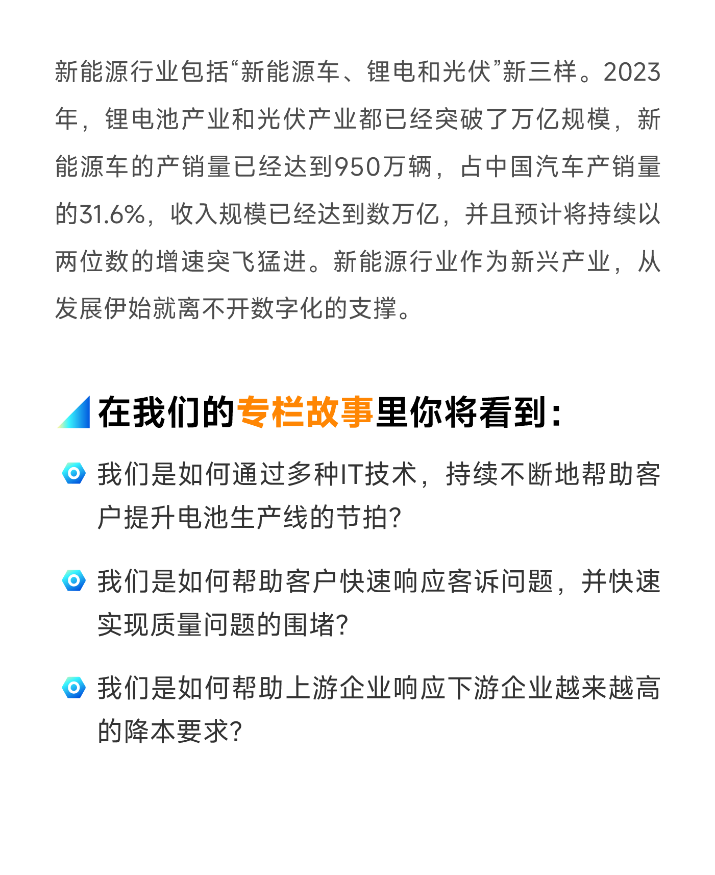 千里之行始于足下,行胜于言。第一期新能源行业专题即将上线,我们将与您分享新能源行业的数字化故事、k8凯发官网行业洞察,还有资深专家及领先企业进行现场分享,更多精彩内容欢迎大家持续关注「数字劲动力,‘智’造塑未来」专栏。