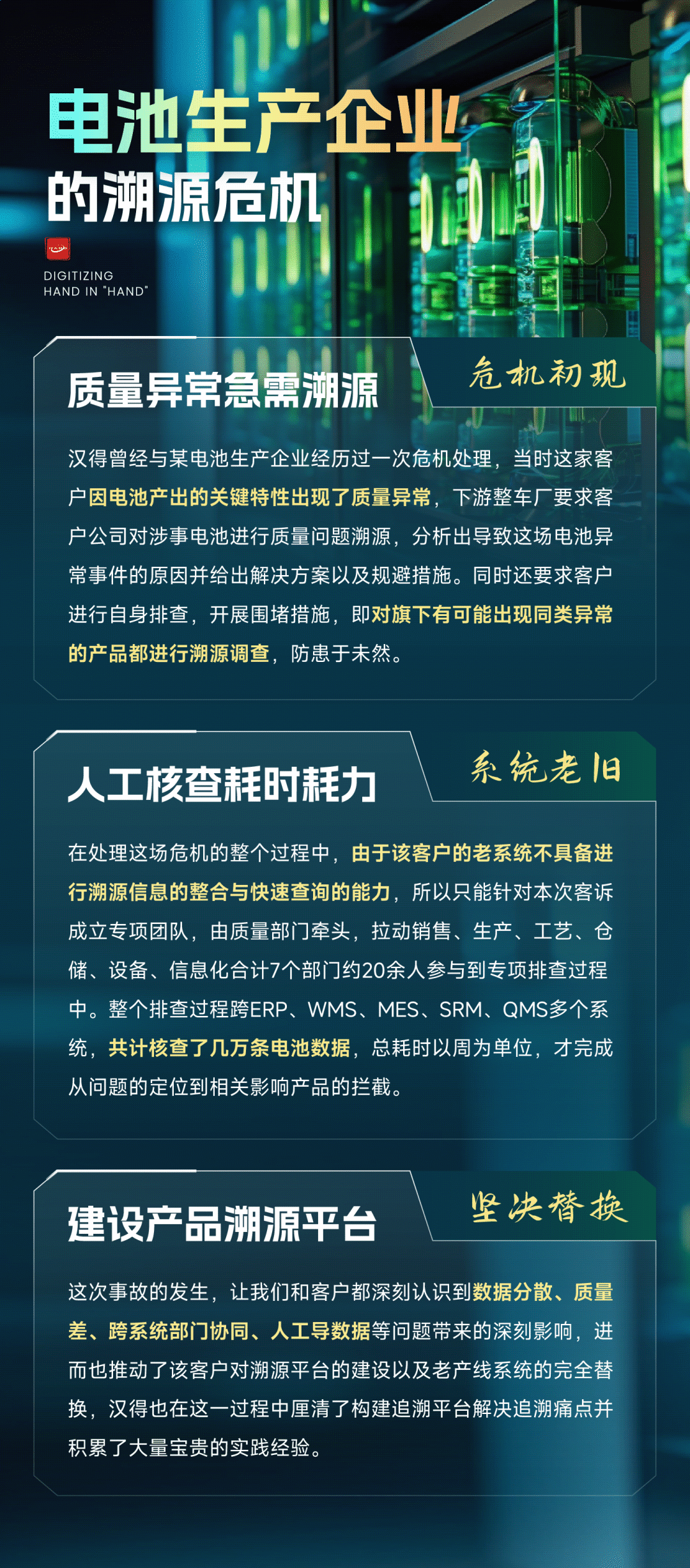 k8凯发官网在过去几年的行业项目经历中也遇到了不少企业因为面临与上述痛点类似的问题,最终导致发生内部变革的案例,其中最为记忆犹新的是与某电池生产企业的事故溯源经历。