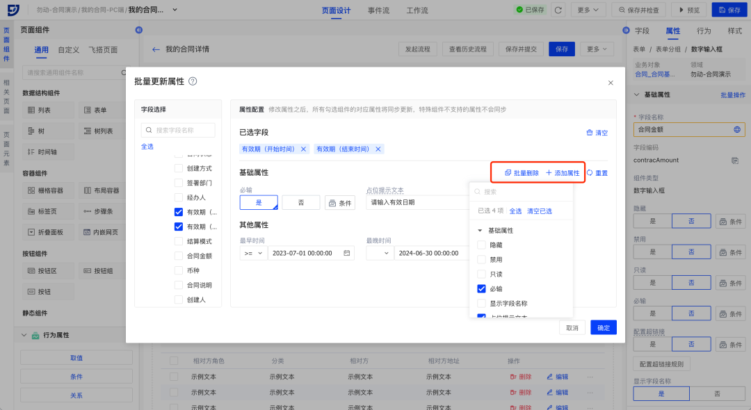 // 场景示例:合同的有效日期,其起始和结束都为合同不可或缺的信息,且需对最早与最晚时间范围予以限制。用户可以通过批量属性配置同时选择这两个字段,并选择相应的属性配置即可。