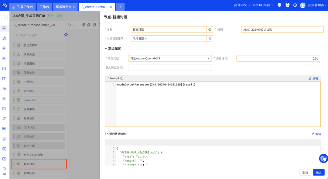 飞搭逐步融合AIGC能力,事务处理流新增智能对话节点,支持调用AI接口处理数据获得返回结果;脚本事件新增智能对话函数,支持调用AI接口处理数据获得返回结果。