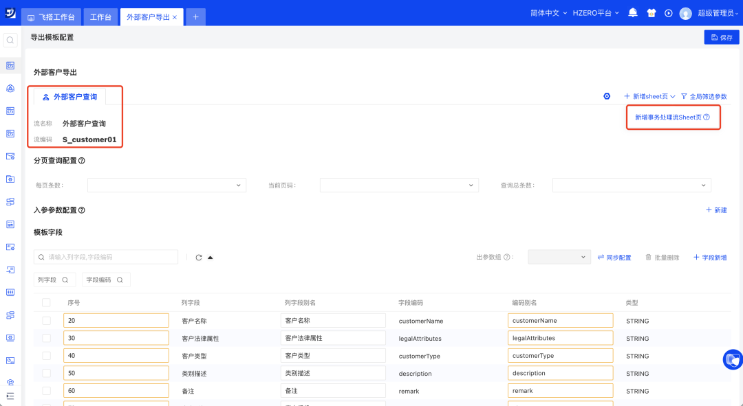 // 场景示例:客户数据需通过外部接口查询获取后再导出,用户可先配置事务处理流调用外部接口获得客户数据,再基于此事务处理流创建为导出模板。