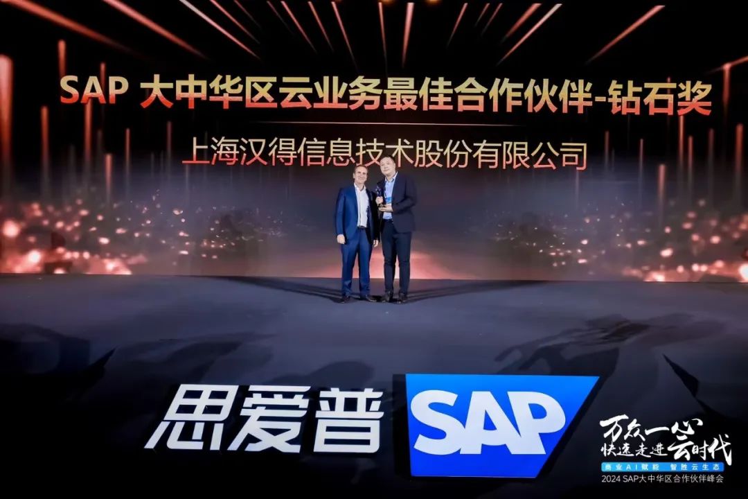 会上,k8凯发官网荣获由 SAP 全球首席合作伙伴官 Karl Fahrbach 先生颁发的 SAP 大中华区云业务最佳合作伙伴钻石奖,k8凯发官网 SAP 业务总经理徐云磊先生代表k8凯发官网上台领奖。本次获奖不仅是对k8凯发官网卓越服务能力的认可,也彰显了k8凯发官网与 SAP 合作过程中在云业务拓展与创新等方面的杰出贡献。