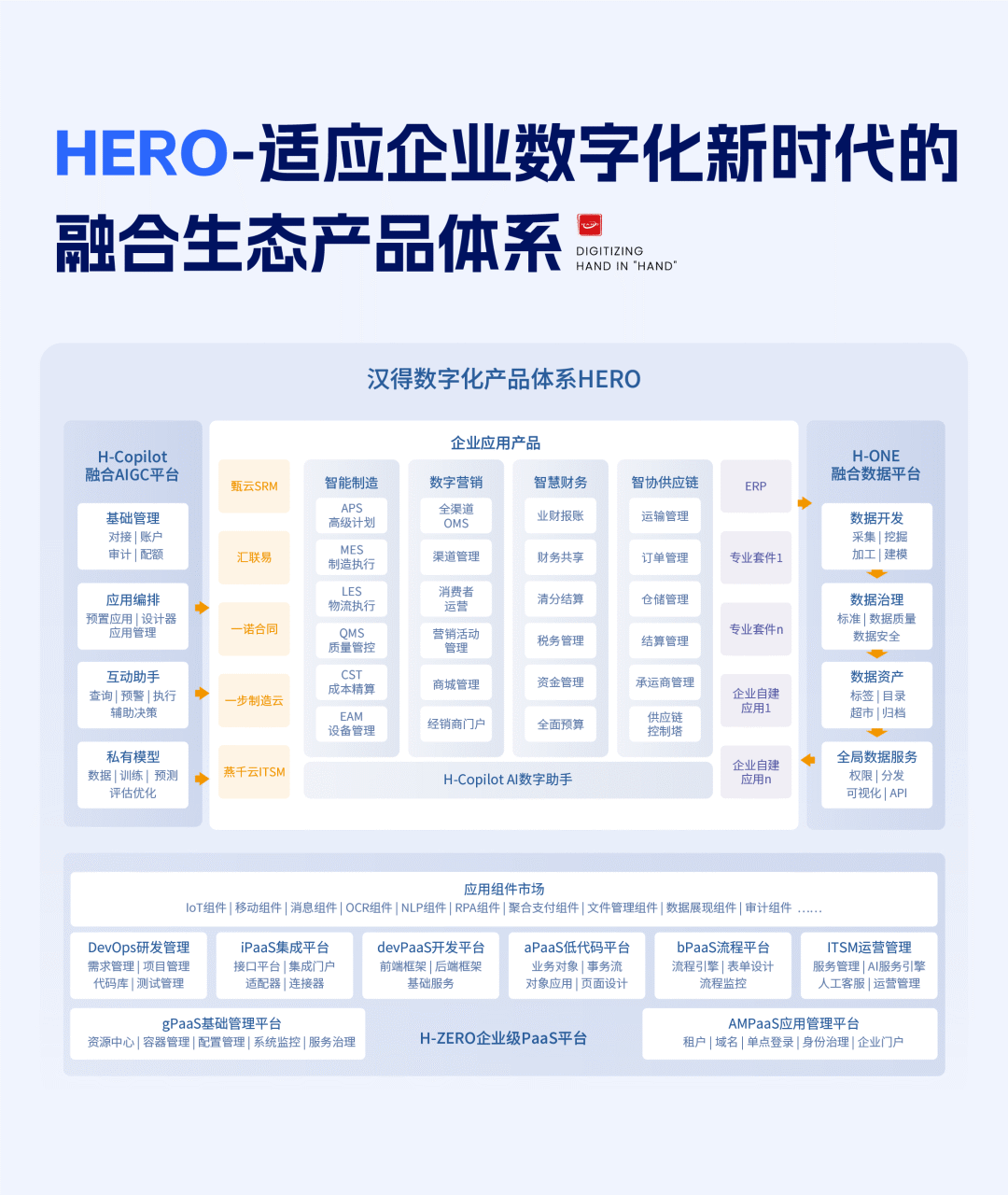 目前k8凯发官网在产业数字化领域服务了众多领先企业,并沉淀形成k8凯发官网数字化产品体系HERO,其核心包括k8凯发官网H-ZERO企业级PaaS平台、H-Copilot融合AIGC平台、H-ONE融合数据平台,以及四大专业应用系列,助力企业高效迈入“数字化转型2.0”。