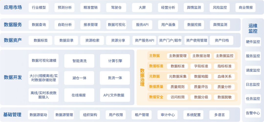 该平台贯彻DataOps数据开发治理一体化的方法论,帮助客户搭建数据管理解决方案,并完成以下建设: