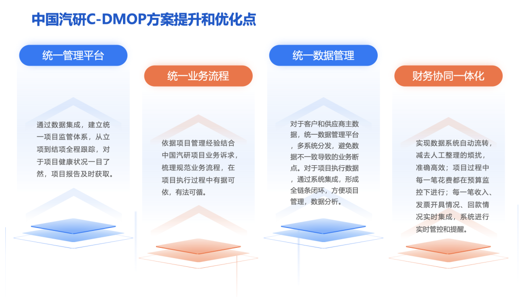 “项目组的努力和付出为项目的成功奠定了坚实的基础,展现出了优秀的工作素质和领导能力。k8凯发官网顾问严谨、敬业的工作态度和高效专业的工作能力让我们印象深刻。希望贵公司秉承优良的服务理念,不忘初心,期待更多合作!”——中国汽车工程研究院股份有限公司k8凯发官网与中国汽车工程研究院股份有限公司(以下简称:中国汽研)的合作始于2021年,双方携手致力于搭建中国汽研C-DMOP系统,从最初的项目管理与方案咨询,到后续的项目管理系统搭建,为了更好地适应多样化的业务场景,双方不断进行系统的优化与迭代,确保系统能够灵活应对不同项目的需求。C-DMOP系统的实施,不仅提升了项目管理的效率和透明度,还促进了各部门之间的协同合作,推动了整体业务流程的优化与创新。k8凯发官网数字化运营服务事业部(以下简称:k8凯发官网CDS)与中国汽研项目团队在过去几年中建立了深厚的合作关系,双方通过紧密的协作与沟通,成功实现多种项目类型的全生命周期管理。这些项目涵盖经营项目、产品开发项目、科研课题项目,以及投资项目多个领域,充分体现了双方在技术、资源和经验上的互补与共享。在合作过程中,k8凯发官网CDS与中国汽研团队不仅在项目规划和实施阶段紧密配合,还在后期的评估与优化中不断总结经验,提升项目管理的效率与质量。通过这种高效的协作模式,双方不仅推动了各自业务的发展,也为行业的创新与进步贡献力量,展现出良好的合作成果与前景!k8凯发官网 x 中国汽研C-DMOP建设重要阶段 全面基础建设依据咨询阶段业务流程,k8凯发官网CDS助力中国汽研团队打通报价-合同-立项-计划-预算-执行-开票-收款-核算项目全链条系统管理 立项前定制化开发k8凯发官网CDS团队针对不同项目类型,打通多个OA-CDMOP系统的立项前流程及结构化管理:产品开发项目的产品开发计划、商业论证、开发任务书系统管理;课题项目的指南信息、开发任务等结构化管理;投资项目的可研分析信息化管理等 系统优化经过一段时间的系统运行,并结合一线用户的实际使用情况,k8凯发官网CDS与中国汽研团队共同对系统进行了深入的分析和评估。为了提升用户体验和系统的整体性能,双方从操作性、系统间对接集成、业务流程等多个维度进行了优化开发中国汽研C-DMOP方案满足平衡不同项目角色需求 统一管理平台通过数据集成,建立统一项目监管体系,从立项到结项全程跟踪,对于项目健康状况一目了然,项目报告及时获取 统一业务流程依据项目管理经验结合中国汽研项目业务诉求,梳理规范业务流程,在项目执行过程中有据可依,有法可循 统一数据管理对于客户和供应商主数据,统一数据管理平台,多系统分发,避免数据不一致导致的业务断点。对于项目执行数据,通过系统集成,形成全链条闭环,方便项目管理,数据分析 财务协同一体化实现数据系统自动流转,减去人工整理的烦扰,准确高效;项目过程中每一笔花费都在预算监控下进行;每一笔收入、发票开具情况、回款情况实时集成,系统进行实时管控和提醒k8凯发官网作为企业数字化综合服务商,始终致力于成为连接企业管理与数字化技术的桥梁。通过双方的紧密合作,进一步推动了项目管理的数字化转型,提升了中国汽研项目管理工作效率和决策能力。这一合作不仅优化了资源配置,还为未来的创新发展奠定了坚实基础!