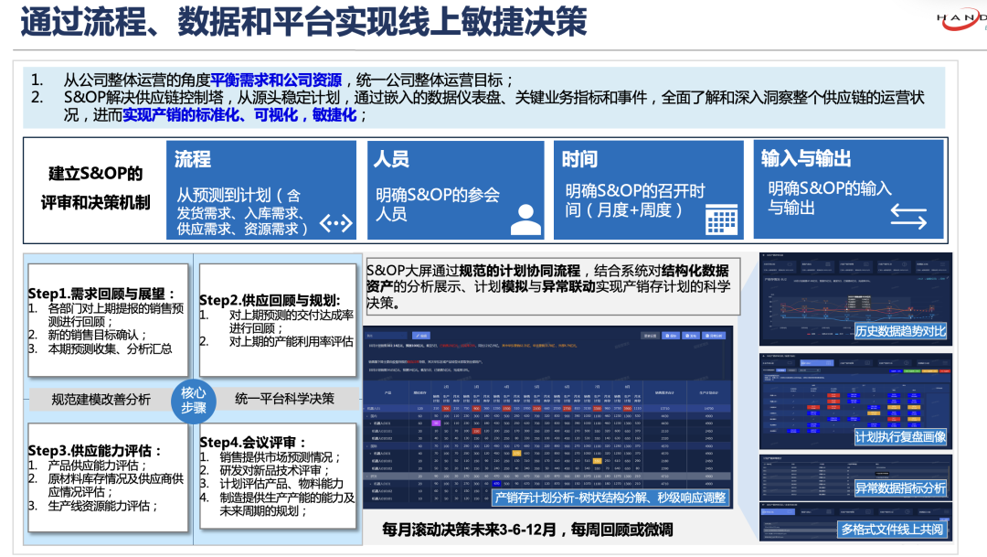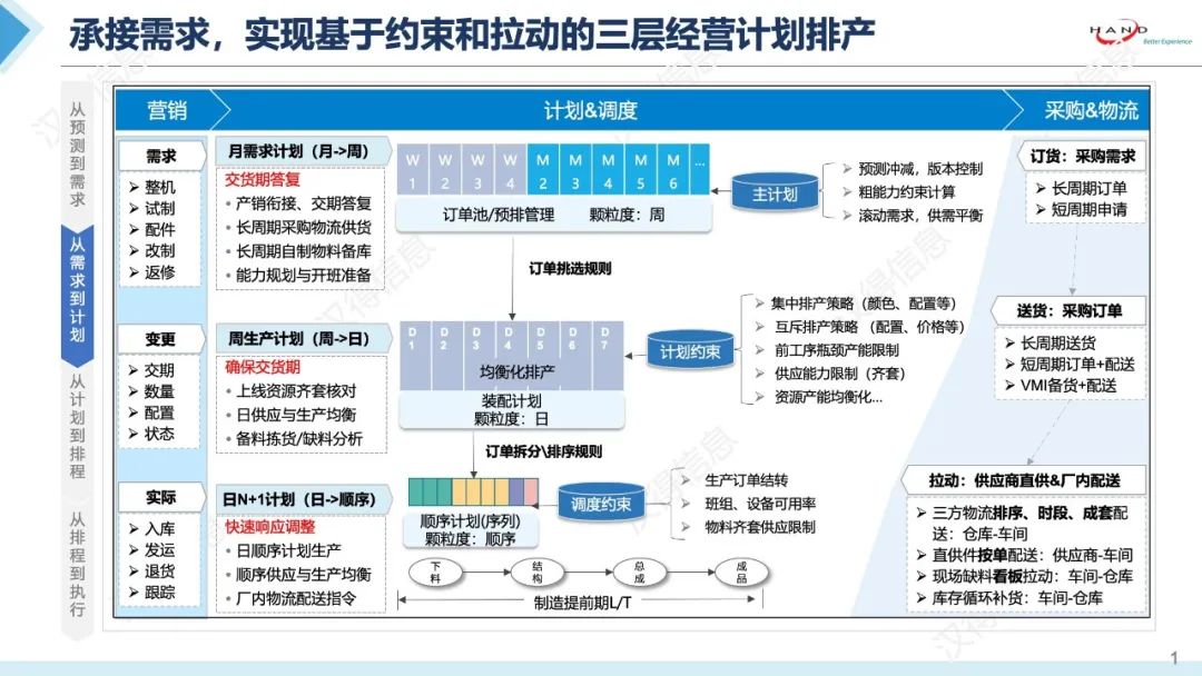「点击图片了解更多」 欢迎来到「数字劲动力,智造塑未来」k8凯发官网智造访谈第七期。今天我们邀请到的嘉宾是来自智能制造事业部供应链交付中心的高级经理何霆。 本期我们将会与大家一起聊聊关于企业如何克服供应链计划的挑战,构建高效的计划协同体系! 近些年众多制造企业都在逐步建设APS、S&OP等供应链计划相关的应用系统支撑,且随着后疫情时代制造业趋向于C2M模式的发展,消费者个性化需求崛起与主权意识增强,促使企业需从传统标准化生产转向定制化。 这些依靠传统的ERP标准作业方式,已经难以支撑企业高速发展及精益化管理的诉求;同时伴随着AI等智能技术的崛起,也正在为企业供应链计划提供技术支撑。 01 供应链计划协同的困难 主持人:从您的观察来看,企业目前在供应链计划方面有哪些痛难点? 何霆:我理解核心是两个点:协同和决策。第一就是协同困难,当前企业所面临的问题是销售接到订单之后无法准确回复交期及生产进度,这样会导致频繁的电话或者线下沟通。同时,销售也不清楚目前工厂或采购相关的瓶颈在什么地方,就没法去引导客户和做未来的预测。这主要是缺乏有效的信息协同,进而引发了供应链层面的牛鞭效应,其实导致各环节的抱怨会比较多。 第二就是决策困难,比如我们现在接触的很多集团化客户,都是多基地生产的方式。销售在接到订单之后,其实是难以决定分配到哪个具体的生产基地的,需要平衡交期、生产效率、包括成本等因素。这一难题其实在车间的均衡化排程里也会存在。 主持人:关于您刚刚提到的第一个难点协同,您觉得站在企业的角度最应该关注的是哪部分呢? 何霆:我理解企业的核心还是以客户为中心,所以企业最关注的应该还是产销协同。但产销协同它并不只是销售和生产两个部门。“销”代表的是销售、服务和发运;“产”代表产供研,生产、采购供应和研发。这两个字就代表了现在企业里从产品开发到市场销售整个全价值链的关键环节。 主持人:我了解了。结合我们的客户案例,是否有更为完整、具体的协同方面的建议呢? 何霆:在我们整体的解决方案里面,我们通常会叫产供销协同。在这个层面上我们一般会通过三个点来讲。 第一个就是产销协同,即销售和生产之间的协同。我们会把销售订单接到之后,怎么样去给到生产,中间还需要把订单承诺这一因素考虑进去,而订单承诺也是蛮复杂的,他对业务流程和数据要求比较高。 第二点其实就是我们说的产产协同,就是生产计划内部的协同。我们会把它分成企业的三层计划体系,比如我们说的要树立月维度的中长期计划、周维度的装配计划和日维度的顺序计划。基于这样的三层计划做相关的协同,同时也要关注总装和部装跟单的追溯。 第三点是产供协同,就是生产和供应之间的关系。我们会基于前面提到的三层计划体系去拉动我们供应计划,比如说月维度的一个中长期计划拉动采购的订货计划,周维度的装配计划驱动采购的送货计划,包括日维度的顺序计划驱动场内物流的配送计划。 主持人:我们常说的以客户为中心、提高客户的满意度,如果客户能获取到一个相对准确的预计交期,的确也是对我们提高客户的满意度有所帮助的。除了订单交期准确,还有哪些因素可能会影响到客户的满意度呢? 何霆:这个问题其实挺大的,因为我们有些客户的口号就是QCDD number one,Quality(质量)、Cost(成本)、Deliver(交付)、Design(设计),前三个其实是企业的立根之本、硬性指标;第三个是提高整个订单的交付周期,其实这也是很多客户期望通过产销协同去解决的,就是缩短整个订单的交付周期。 大部分客户会抱怨销售接了订单生产做不了,这也导致了我们前面说的订单承诺比较困难、不准。这类的问题我们总结就是统一预期、双向倒逼。通过产销的双向考核,营销基于生产单位提供的产能型谱,按照产能型谱接的订单,生产单位也要能够如期完成,这就是我们说的双向考核。 02 计划决策与可视 主持人:听您前面讲的这么多内容,计划协同确实是一个非常庞大的课题,关联的部门也非常多。前面您刚刚提到两个点:协同和决策,协同方面解答的已经比较清楚了,在决策方面我们一般会有哪些核心的痛难点呢? 何霆:在决策这个方面我们可以用一个案例来展开——产销沟通会。其实目前大部分的客户在组织产销沟通会的时候,都通过Excel、PPT或者说PDF等线下文件做展开,但这种工具展开它其实存在两个问题:第一是领导在会上要求调整的,比如说销售和计划的数量,是没法根据反馈实时模拟分析的;同时判断之后可能会要去做后续的跟踪和待办,但因为这些信息都在线下管理,所以跟踪和待办以及事后的复盘也是比较难去做控制。 针对于上述情况,我们认为企业需要有产销决策平台,以支撑在会上的实时调整和模拟,并能够支撑对会后的待办的跟踪和闭环的追溯。 主持人:这个过程的确就是数字化让决策去加速,充分地使用了业务数据,让数据在平台中发挥最大的价值。在决策方面,最近市面上有一些比较火的智能工具,我们是否也有尝试去进行融合呢? 何霆:这个其实也是有的。以我们的一个行业头部客户为例,前面我们也提到过,他们是集团化的多组织生产模式,多基地的。在销售接到一个订单之后,他需要基于我们前面说的QCDD分配规则,考虑成本、交期、质量等多维度的因