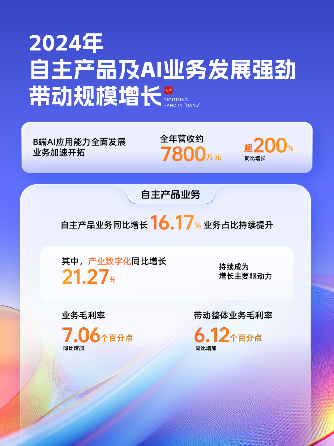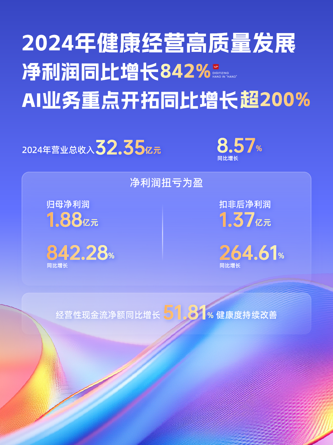 2024年健康经营高质量发展,利润现金流双增长,AI业务增长强劲。2025年一季度持续稳定健康经营,持续加速发展企业AI业务。