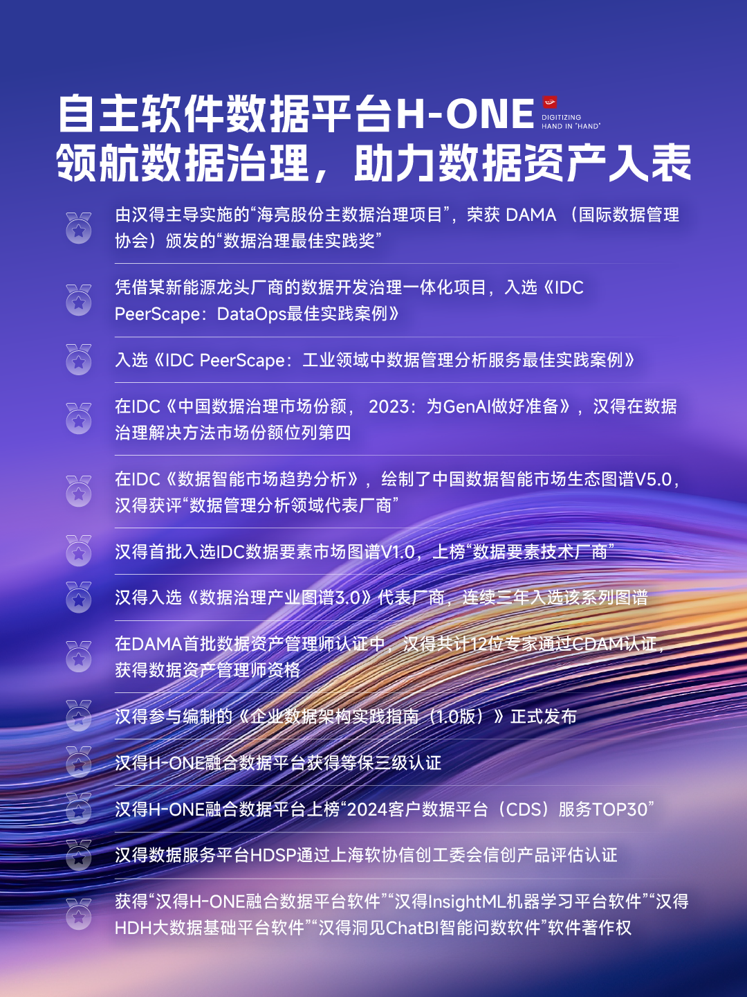 自主软件数据平台H-ONE,领航数据治理,助力数据资产入表,H-ONE始终深耕数据领域,提供从咨询到产品再到服务的一站式全域数据解决方案,全方位赋能企业数智化建设。