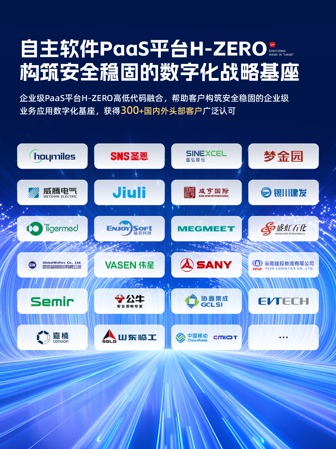 企业级PaaS平台H-ZERO,数字化筑基,帮助客户构筑安全稳固的企业级业务应用数字化基座,获得300+国内外头部客户广泛认可。