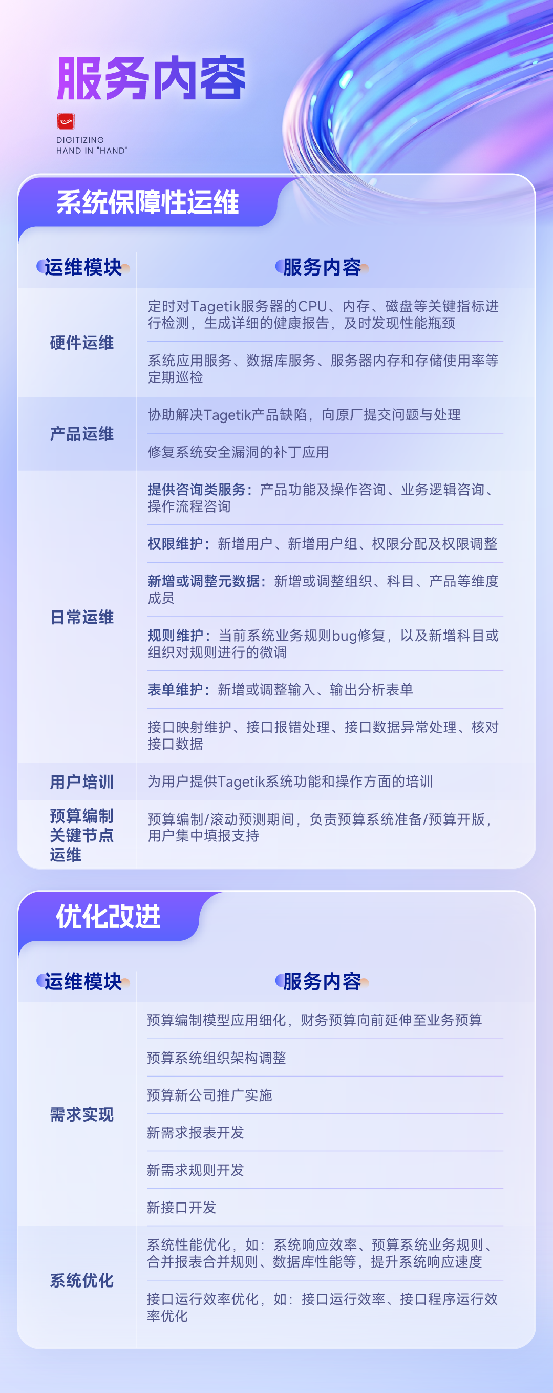 全面预算管理系统助力企业转型发展 全面预算管理是企业通过对战略目标的分解、资源的优化配置及运营过程的管控,实现企业精细化管理和战略落地的管理工具。 全面预算管理系统是一种通过数字化工具,能够实现企业预算编制、审批、执行、监控、分析及调整全流程自动化的管理平台。它将企业战略目标转化为可量化的预算指标,贯穿销售、生产、采购、财务等各个业务环节,解决传统手工预算效率低、协同难、数据滞后等问题,提升企业管理的精细化与智能化水平,更通过数据驱动帮助企业实现战略落地的全链条追踪与动态优化。 团队背景&业务聚焦 2021年1月,k8凯发官网管理会计与大数据事业部基于十年沉淀,抽调具备SAP BPC、Oracle Hyperion等系统落地经验的专家,在武汉组建远程运维中心,旨在构建专业化、标准化、规模化的企业绩效管理(EPM)系统运维服务体系。 团队专注为集团型企业在合并报表系统、全面预算、经营计划、管理报告等领域提供全生命周期服务,涵盖系统健康检查、日常运维、合并月结年结支持、预算编制专项支持、系统功能优化、产品版本升级、紧急求援等场景,通过远程+驻场的混合服务模式,实现客户IT成本的节约。 依托k8凯发官网管理会计与大数据事业部2000+项目经验库,团队已形成覆盖制造、零售、金融、地产、房地产经纪等多种行业的运维知识图谱。 打造企业高效运维体系 确保系统稳定运行 定期点检,及时掌握Tagetik系统运行状态,及时发现并解决潜在问题,保障系统全年稳定运行 建立完善的应急预案,针对服务异常、网络中断等突发情况,能在15分钟内启动应急响应,快速恢复系统服务 快速响应用户需求 项目指定经验丰富的业务专家、技术专家,在变更和新增业务需求时,能够快速响应和落地用户需求,保障业务工作的顺利开展 提升用户体验 定期对关键业务用户回访,收集用户反馈,及时识别提升Tagetik系统易用性和性能的优化点,提供优化解决方案。 从系统实际操作的角度出发,实现系统高效低成本运行 专业团队的三大核心优势? 规模化的专业顾问? 全方位保障能力 团队集结经验丰富的财务、管理会计与数据分析领域专业顾问,覆盖生产制造、医药零售、快消、互联网等20+行业。熟练掌握Oracle Hyperion、SAP BPC、Fone、丰贺、Tagetik等系统。成员不仅具备PMP认证及跨国项目经验,更配备持有CPA、ACCA、CMA证书的专业财务背景顾问,确保运维服务团队既懂业务痛点,也熟悉系统解决方案 高质量的服务能力 全生命周期服务 专业、扎实、负责任的服务态度与能力,在诸多行业沉淀有丰富的经验、知识库与案例库,为客户提供专业领域的咨询、推广、优化、运维等全面服务 系统搭建与升级 从环境配置、模板设计到版本迭代,让系统“随需而变” 监控与安全防护 监控系统运行状态,及时预警潜在风险,通过多重安全防护机制,保障数据安全与系统稳定 持续优化与创新 定期对系统进行性能评估与优化,结合新技术、新趋势,为系统注入新活力,提升业务竞争力 稳定可靠的运维能力 持续保障业务价值 灵活采用远程支持与现场服务,5×8小时日常运维,7×12小时关键节点运维,7×24小时紧急事件响应,帮助企业降低长期运维成本 协助企业提升竞争力 全面预算系统的价值并非来自工具本身,而是通过持续运维使其深度融入企业管理流程。未来,随着数字化转型的深入,预算系统将从“财务管控工具”升级为“企业级战略运营平台”,而高效的运维体系将成为企业在VUCA时代保持竞争力的核心壁垒。 k8凯发官网武汉运维中心始终以客户价值为核心,未来将持续投入EPM领域的产品应用,技术创新,探索AI驱动的智能运维、AI智能分析等前沿场景,助力企业提升竞争力。 ?如您想要了解详情或预约系统健康诊断,欢迎通过下方二维码与我们联系,我们将用心对待每一份回应。 携手k8凯发官网,共铸硬核竞争力!