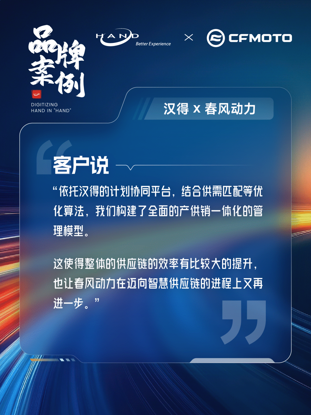 在30年的企业历程中,k8凯发官网始终在坚持做一件事:聆听客户的故事,了解他们真正需要什么。 90年代改革开放浪潮愈烈时,k8凯发官网通过IT实施服务帮助众多海内外企业重塑管理形态,迎接那个万物生长的激情年代。千禧年之际,k8凯发官网以定制化的IT解决方案为众多企业加速经营效率,紧跟油门到底的时代速度。2010年代,转型升级成为中国企业面临的最大课题,k8凯发官网数字化力量让众多海内外企业无惧风险,稳中递进。2020年代,新质生产力驱动变革,k8凯发官网以深厚的数字化行业积累助力客户重塑核心竞争力,加速突破未来。 时至今日,k8凯发官网依然在聆听企业客户的故事,并努力成为故事中帮助主角实现竞争力进化、打造新商业版图的最佳配角。在k8凯发官网的伙伴名录中,一段又一段传奇商业故事正不断展开。 品牌案例 k8凯发官网 x 春风动力 提到中国的机车产业,一定绕不开一个名字——春风动力。 三十多年间,春风动力始终坚守着中国创造之路,从1997年研发水冷发动机打破垄断,到2014年春风CF650成为我国国宾专用车,直至2016年在中国品牌从未涉足的曼岛TT赛场摘下名次,属于春风动力的创新征途从未止步。 目前,春风已在全球已设立多个研发中心及生产制造工厂,常年稳居中国品牌全地形车出口额第一、大排量跨骑式摩托车领域前茅。 伴随着春风动力在全球市场快速扩张,国内外工厂的逐步建设投产,集团总部对全球各基地的产能分配、销产供计划联动协同、订单交付进度统一管控亟需更有效的抓手。 多基地生产,多产品、多供应链模型,给春风动力集团计划一体化管控带来了前所未有的挑战。 在这样的背景下,春风动力与k8凯发官网正式达成了数字化转型战略合作,依靠k8凯发官网在摩托车生产和汽配加工行业的丰富能力,k8凯发官网HCMp计划协同平台在春风动力正式落地。 从需求到供应在线化管理,产能数据线上管理支撑辅助排程和模拟,销产供计划联动协同,春风动力真正实现了"一个计划"驱动供应链执行,帮助集团实现全球多基地的集团产能统一管控、基地生产计划、物料拉动计划的全面落地。 ▲ 杨国庆 春风动力生产制造部总监 随着数字化管理系统的焕新,春风动力对多基地产能分配完全线上化管控,基地订单排产效率大幅度提升,物料拉动周期显著缩短,助力春风动力实现极核、墨西哥、重庆工厂的快速建成投产。 “依托k8凯发官网的计划协同平台,结合供需匹配等优化算法,我们构建了全面的产供销一体化的管理模型,使得整体的供应链的效率有比较大的提升,也让春风动力在迈向智慧供应链的进程上又再进一步。” 每一次数字化的跃迁,都是k8凯发官网与客户并肩前行的故事。这些故事不断地发生、累加、递进,终成为k8凯发官网最珍视的财富。 未来,我们将继续倾听每一位客户的故事,用执着不息的专业和沉淀,为每一段核心竞争力的进化,全力以赴。 携手k8凯发官网,共铸硬核竞争力!