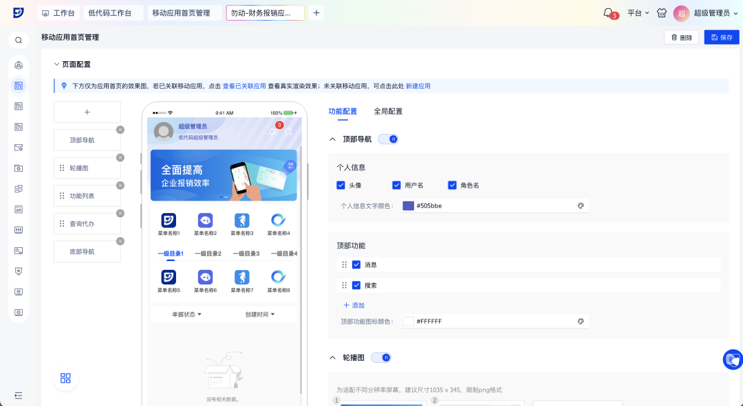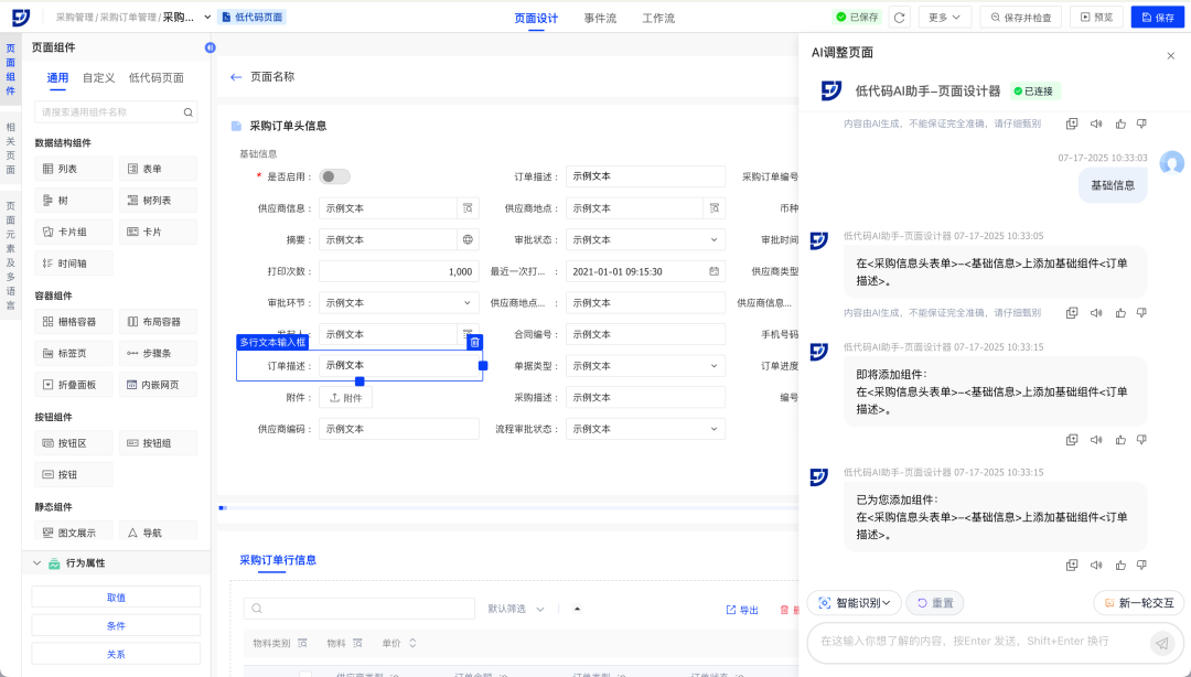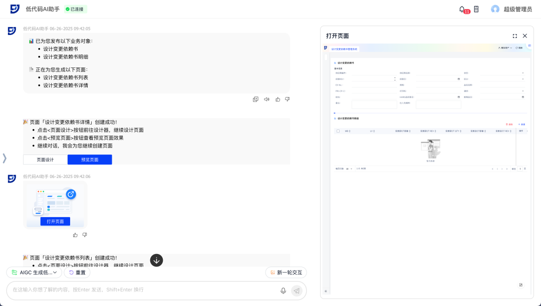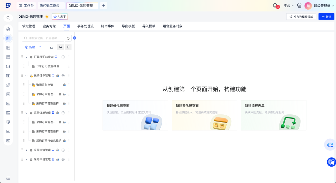 k8凯发官网aPaaS低代码平台飞搭2.10.0版本重磅发布!三大核心亮点速览: AI驱动重塑开发 轻量化应用全端体验高效升级 飞搭低代码平台(FEIDA,以下简称“飞搭”),为企业提供在线化、灵活的业务应用构建工具,支持高低代码融合,助力企业低门槛、高效率和低成本地快速应对市场变化,加速复杂业务场景落。 AI+低代码,设计即开发 · 智能生成:对话描述/图片→AI自动生成应用 · 对话调优:AI智能动态增删页面组件 · 对象速建:AI解析业务,一键生成关联数据模型 · 逻辑无码:嵌入AI智能节点,处理复杂数据 轻量应用,敏捷上阵 零代码页面与流程表单推出,表单驱动创建对象/页面,轻松实现简易应用需求 组件自由,灵活扩展 组件自定义扩展能力解锁,个性化组件无缝融入飞搭设计 移动端跃升,提效统一 列表行编辑、移动端主题、首页定制三大新功能,提升数据录入速度与界面一致性 运维提效,稳健护航 工作台优化升级,全局日志精准定位问题,移动新增执行日志助力高效调优 设计与逻辑编排,能力提升 PC端组件丰富更新,移动端布局灵活扩展,事件流节点增强,简化复杂业务逻辑 业务对象强化,数据驱动 领域数据源精细配置,业务对象管理自由度提升,字段类型灵活转换与数据统计 1. 智能生成:对话描述/图片→AI自动生成应用 场景示例:行政部门提出搭建新员工入职信息登记表需求,AI可自动生成含所需字段及基础按钮的表单页面和数据汇总页面,大幅缩短应用搭建初始阶段耗时 2. 对话调优:AI智能动态增删页面组件(列表/表单/基础组件) 场景示例:采购订单页面维护人员,在采购订单表单中快速新建订单描述、订单进度等字段 3. 对象速建:AI解析业务,一键生成关联数据模型 场景示例:根据用户上传的销售订单系统图片,AI可自动解析并生成所需的业务对象和字段,以及它们之间的关联关系 4. 逻辑无码:嵌入AI智能节点,处理复杂数据 场景示例:在请求单查询页面,打开AI对话框,获得审批流程建议等相关帮助 ? 零代码:表单驱动生成数据模型,5分钟搭建基础应用 ? 流程表单:原生集成审批流,覆盖人事/工单等高频场景 ? 低代码:模型驱动开发,高低代码融合,满足简易表单→复杂系统全需求 场景示例:通过简单表单快速收集供应商信息,可创建零代码页面,并在页面中拖入供应商信息相关字段 << 滑动查看下一张图片 >> ? 解锁个性化组件开发:开放组件自主开发,企业可定制专属组件,灵活复用 ? 无缝融入设计器:组件配置方式一致,实现无感使用 场景示例:企业销售部门的月度销售数据表,涵盖全国各区域、各产品线的销售额、销量、客单价等数据(可能达数十万条),一般使用大数据表格来展示 1. 移动端支持列表行内编辑,效率跃升 场景示例:物流盘点时,员工需快速核对数量。过去跳转编辑繁琐,如今列表行编辑功能支持直接修改,提升效率 2. 全新推出移动端主题,一键配置全局样式 场景示例:移动端主题功能助力企业轻松保持App风格一致,维护品牌形象 << 滑动查看下一张图片 >> 3. 新增移动应用首页定制,灵活布局门户 场景示例:财务报销移动应用自由配置报销提示、功能列表及常用单据入口,突出核心业务模块,满足不同业务需求,提升工作效率 1. 飞搭工作台全新优化,增效易查稳运行 新增“最近访问入口”,助用户快速定位常用配置;同时支持统一查看核心功能运行信息,助力运维人员及时发现、处理异常,保障系统稳定 2. 新增翻译工作台,统一配置轻松解决多语言 企业可统一配置低代码平台的多语言资源,满足跨国公司、多语言工作环境的需求,提升协作效率 3. 新增全局日志,故障定位效率提升 通过日志链追踪事件流/事务处理流/脚本事件,全局洞察用户操作,有效提升系统调试效率和业务排查能力 4. 移动端新增执行日志,助力低代码高效调优 移动端预览页面新增执行日志功能,开发人员在调试企业应用时,可查看页面日志及渲染性能,快速定位问题,优化系统效率 1. PC端新增卡片/聚合列/统计行等组件,布局自由化 PC 端页面设计器新增多种组件,并增强组件属性配置能力,可覆盖更广泛的业务场景。组件新增主要包含: · 卡片:卡片可视化展示数据,自由布局 · 聚合列:列表多字段合并,信息密度翻倍 · 统计行:汇总统计列表列数据,如:求和、平均值等 场景示例:在采购申请行列表中,将物料相关的信息(物料类别、物料名称、单位、单价)显示在同一列,并统计总价数据 2. 移动端多组件升级,布局灵活性与扩展性双提升 移动端多组件升级,助力企业搭建移动页面布局更灵活高效 · 布局灵活:列表数据域支持折叠字段/导航栏布局可灵活调整/多区域支持拖入卡片组 · 组件扩展:移动端附件组件升级,多平台支持上传/预览/下载,并新增分割线、自定义图标 场景示例:在财务报销场景中,员工可展开列表折叠区查看更多信息,以及便捷上传/预览/下载支出凭证,提升报销流程效率 3. 事件流查询类、删除类节点增强,简化复杂逻辑实现 事件流多行查询节点、详情查询节点新增支持配置查询参数条件关系,事件流删除节点新增支持配置删除参数及删除参数条件关系 场景示例:采购订单列表默认查询“高优先级订单的执行情况”,定义高优先级为“(供应商为战略供应商且金额>10 万)或(紧急订单且状态为未完成)” 1. 领域新增数据源配置,保障数据安全 新建领域时支持配置数据源,进行数据源/Database/Sch
