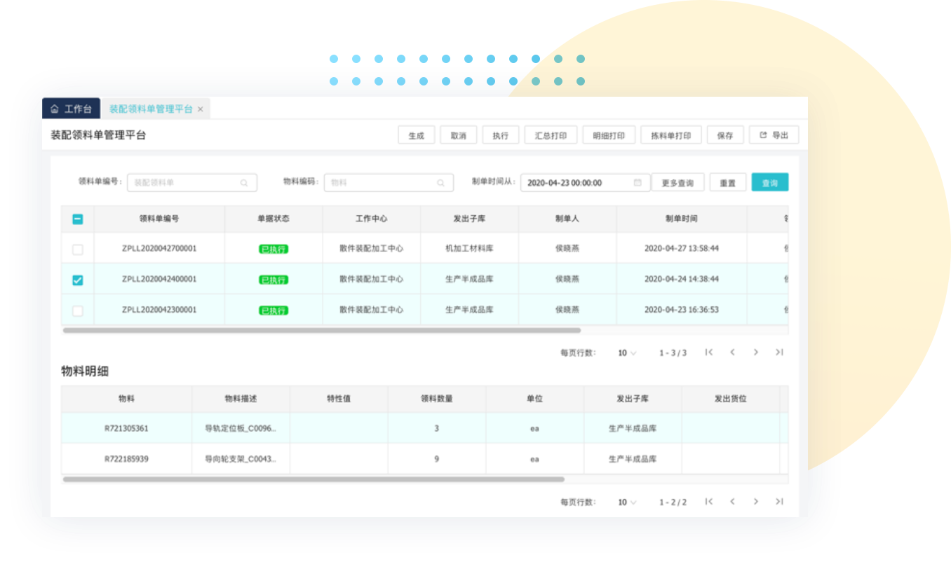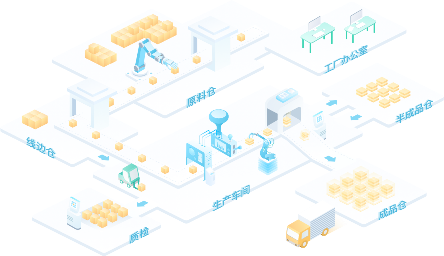 原料入库快速生成条码;原料领用、半成品出入库、成品入库发货等各类物料库存转移环节均可通过扫码完成快速出入库,及时更新库存信息;支持多种类型条码