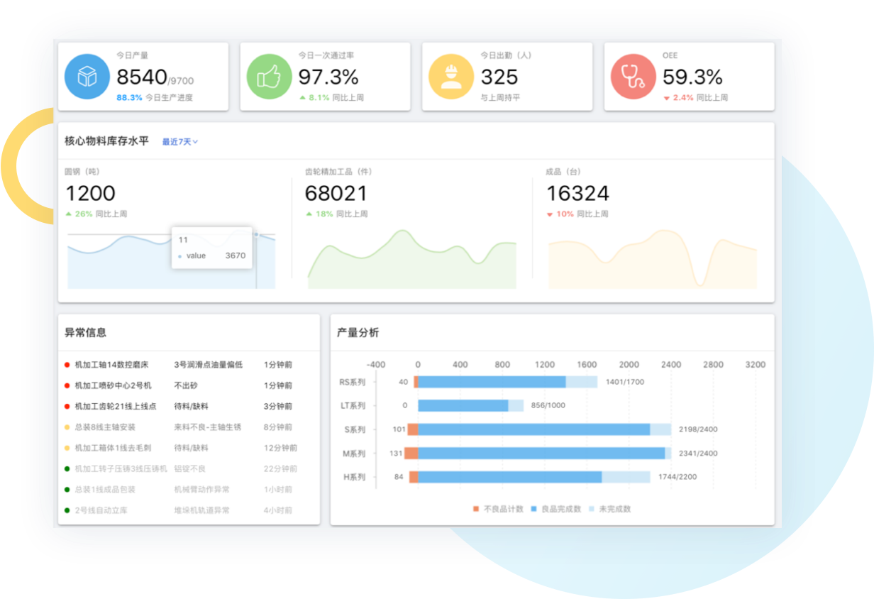 生产工单自动分配;工艺图纸电子化管理;移动、PC双客户端均可进行生产报工;生产工时自动统计;安灯体系实时监控,异常反馈及时处理